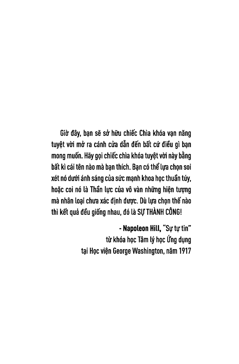 Công Thức Tự Tin - Để Vươn Tới Sự Tự Lập Và Thành Công Thiếu tự tin là một trong những căn bệnh phổ biến nhất của thế giới ngày nay, gây ra sự bất lực tràn lan, thiếu tự chủ, thiếu mục đích, trì trệ và tuyệt vọng đặc trưng của xã hội hiện đại. Nhưng như ông trùm ngành thép Andrew Carnegie đã nhấn mạnh với Napoleon Hill: “Tự tin là một trạng thái tâm trí, là yếu tố cần thiết để thành công, và điểm khởi đầu của việc phát triển lòng tự tin và sự rõ ràng về mục đích.” Niềm tin vào bản thân và khả năng của bạn quyết định việc bạn thất bại hay thành công. Công thức tự tin giúp bạn tăng cường sự tự tin của mình thông qua việc áp dụng các chiến lược của Hill để kiểm soát suy nghĩ của bạn. Bằng cách thực hiện những nguyên tắc này, bạn sẽ không chỉ có thể suy nghĩ và hành động tốt hơn – thu hút nhiều cơ hội hơn, tạo được ảnh hưởng và củng cố các mối quan hệ - mà còn có thể truyền đạt phẩm chất quan trọng này cho những người khác. Cuốn sách giúp bạn mở khóa thành công và sự thỏa nguyện bằng cách trang bị cho bạn: Giải phóng nỗi sợ hãi, bất an và những hạn chế mắc phải trong thời thơ ấu và thiếu niên Tạo điều kiện cho tâm trí tin vào sự chắc chắn thành công của bạn Hành động mạnh dạn, tự tin nhằm đạt được mục tiêu chính xác định của bạn Chinh phục mặc cảm tự ti của bạn thông qua nguyên tắc trí tuệ ưu tú Xây dựng tính tự lập và lòng tự trọng của tuổi trẻ ngày nay Bạn đang trên hành trình sống tự tin và có mục đích. Khi bạn thực hiện các nguyên tắc của Hill, bạn sẽ trau dồi trạng thái tinh thần của mình để sẵn sàng đón nhận những cơ hội phong phú dành riêng cho bạn. Công thức tự tin sẽ giúp bạn xây dựng ý thức mạnh mẽ về giá trị bản thân để bạn có thể nhận biết cơ hội, hành động để đạt được ước mơ và tăng cường sự bền bỉ của bạn tốt hơn. Thông tin về tác giả Napoleon Hill là tác giả truyền cảm hứng nổi tiếng rất được yêu thích tại Mỹ. Ông có một sự nghiệp viết lách, giảng dạy vô cùng thành công về những nguyên tắc thành công. Các tác phẩm của ông được coi là tượng đài đối với việc xây dựng thành tựu cá nhân và cột mốc quan trọng trong phong trào truyền cảm hứng từ những cuốn sách kĩ năng.
