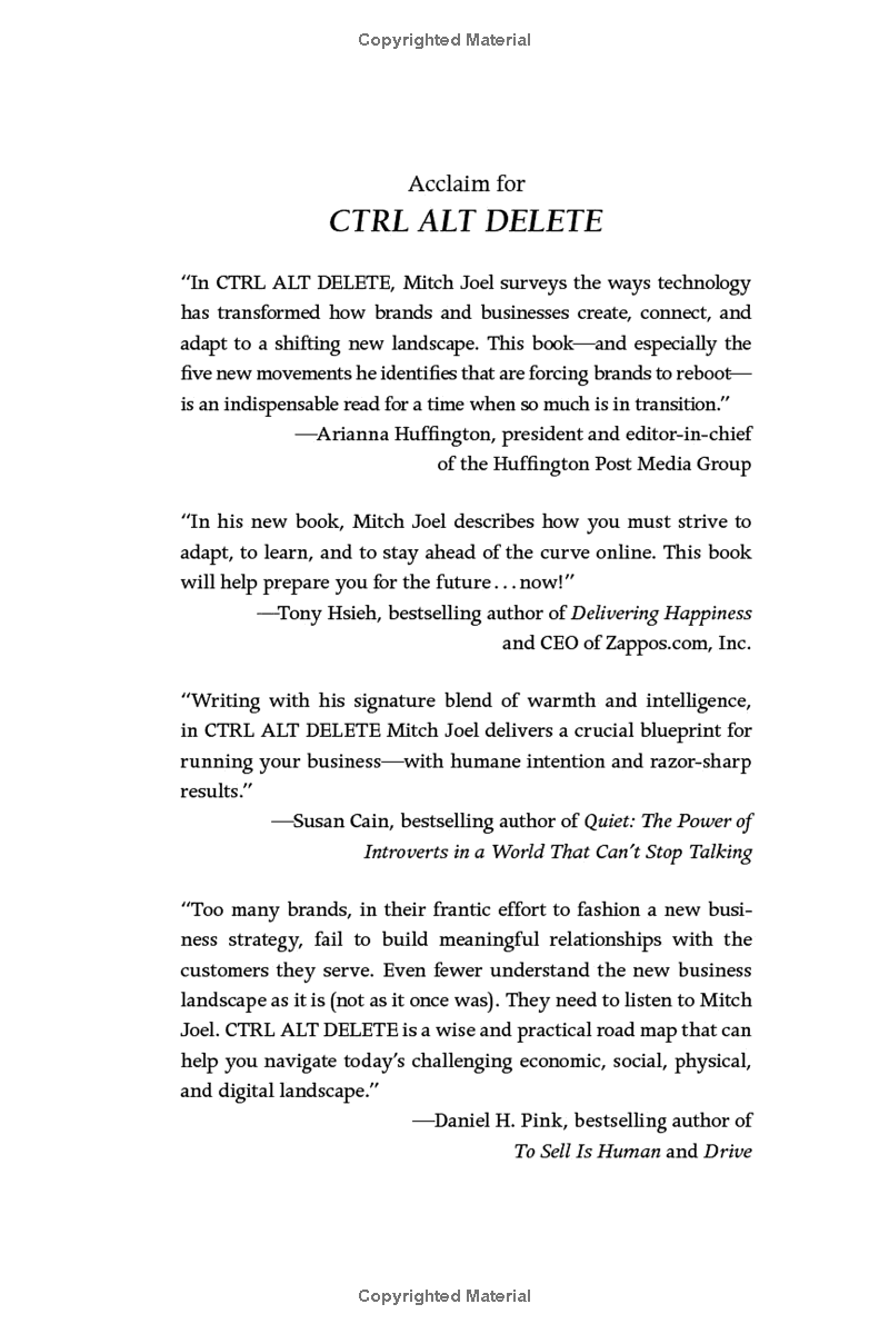 Mitch Joel, one of the world's leading experts in new media, warns that the time has come to CTRL ALT DELETE. To reboot and to start re-building your business model. If you don't, Joel warns, not only will your company begin to slide backwards, but you may find yourself unemployable within five years.