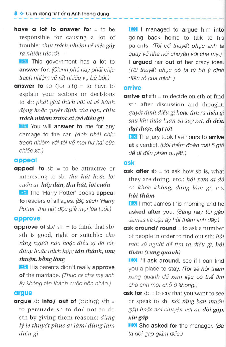 Nhìn chung, xét về mặt văn phạm lẫn ngữ nghĩa, cụm động từ là phần gây không ít khó khăn cho người học tiếng Anh. Nhằm giúp người học có thêm tài liệu để tham khảo, tra cứu và học cụm động từ, chúng tôi biên soạn CỤM ĐỘNG TỪ TIẾNG ANH THÔNG DỤNG.