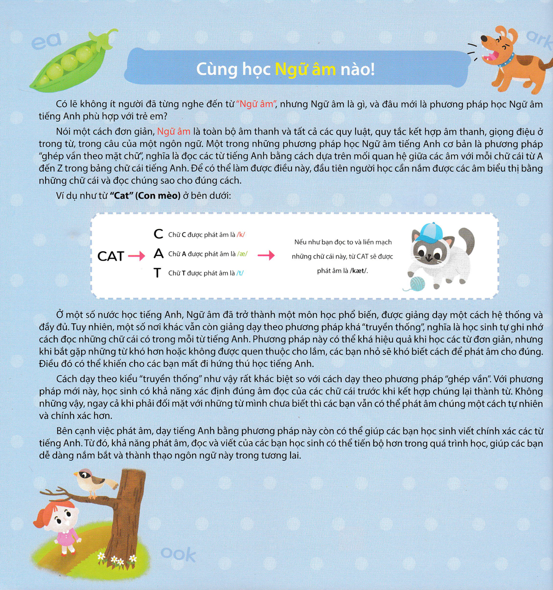 Ngữ âm là một phần rất quan trọng trong việc học ngoại ngữ nói chung và việc học tiếng Anh nói riêng, bởi vì nó chính là nền tảng để các em có thể nghe hiểu tốt, phát âm chính xác và viết đúng chính tả, từ đó giúp các em dễ dàng học các từ mới hơn và tạo tiền đề để các em phát triển đồng đều cả bốn kỹ năng nghe, nói, đọc, viết.   Với những ví dụ sinh động, dễ tiếp thu, kèm theo các bài thực hành nâng cao đầy tính thực tiễn và các audio dạy phát âm chuẩn bằng giọng Anh-Mỹ bản xứ, bộ sách sẽ cung cấp cho các em những kiến thức cần thiết để học ngữ âm tiếng Anh. Đúng như tên gọi, bộ sách được chia thành ba cấp độ từ cơ bản đến phức tạp, hướng dẫn các em rèn luyện từng bước một để nắm chắc các âm trong tiếng Anh. Ngoài ra, bộ sách còn lồng ghép những bài hát vui nhộn và những câu chuyện ngắn được minh họa đẹp mắt, hứa hẹn sẽ giúp cho việc học tập của các em thêm phần thú vị và hiệu quả.   Bộ sách gồm các chủ đề