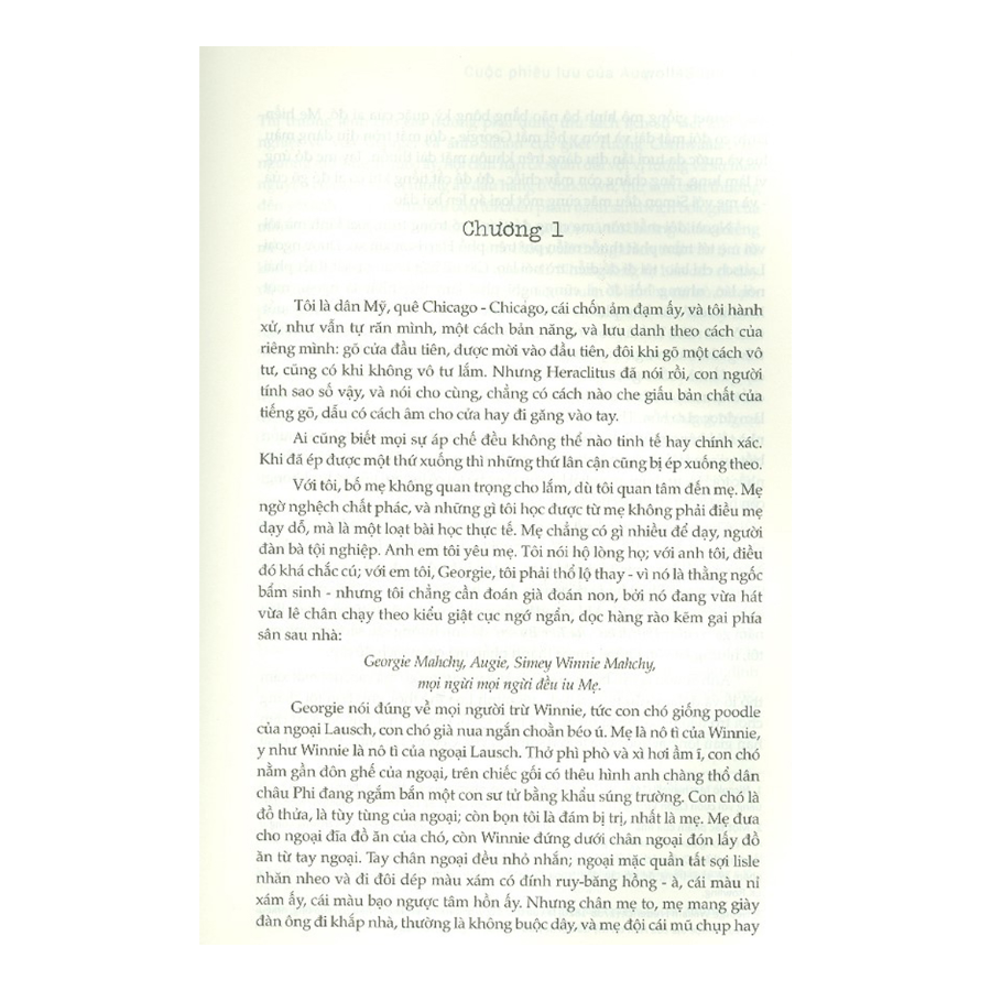 Với Cuộc phiêu lưu của Augie March, Saul Bellow đã kể lại hành trình độc nhất vô nhị của người hùng du đãng picaresque Augie March: một thanh niên thậm duyên dáng, một kẻ cơ hội chủ nghĩa xảo trá, một gã khờ trong lưới tì Rời bỏ xuất thân Do Thái di cư nghèo khổ, Augie March hăm hở bước vào công cuộc tìm kiếm lẽ sống của đời mình dưới các ống cống và nhà ga tại Chicago, quẩn quanh những trường đại học ở New York, hay ngoài rừng rậm Mexico giữa bầy thằn lằn hoang dã Hành trình phi thường của Augie March là biểu tượng cho sự tái sinh lý tưởng tự do của giấc mơ Mỹ, và đặc biệt hơn, đã “viết lại” ngôn ngữ của cả một thế hệ.