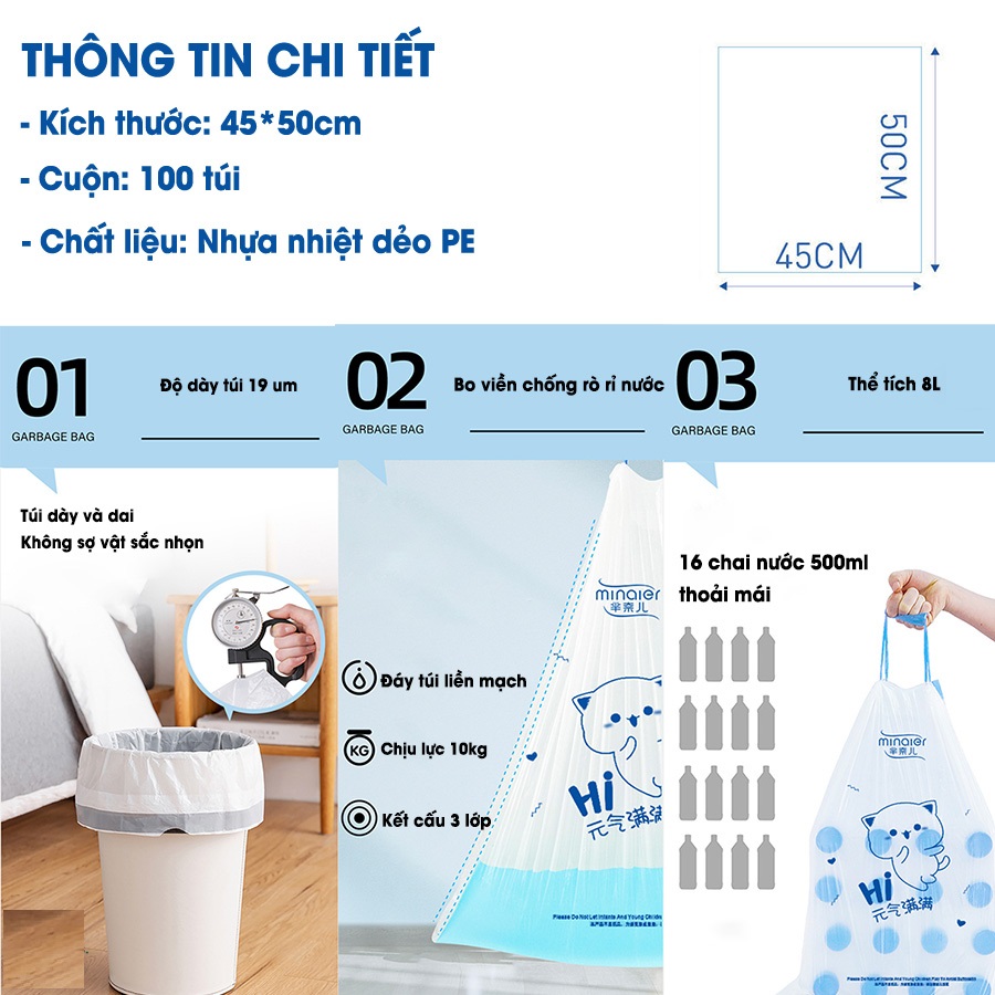 - Đóng gói: 100 túi/cuộn ĐẶC ĐIỂM NỔI BẬT CỦA TÚI ĐỰNG RÁC DÂY RÚT MINAIER: