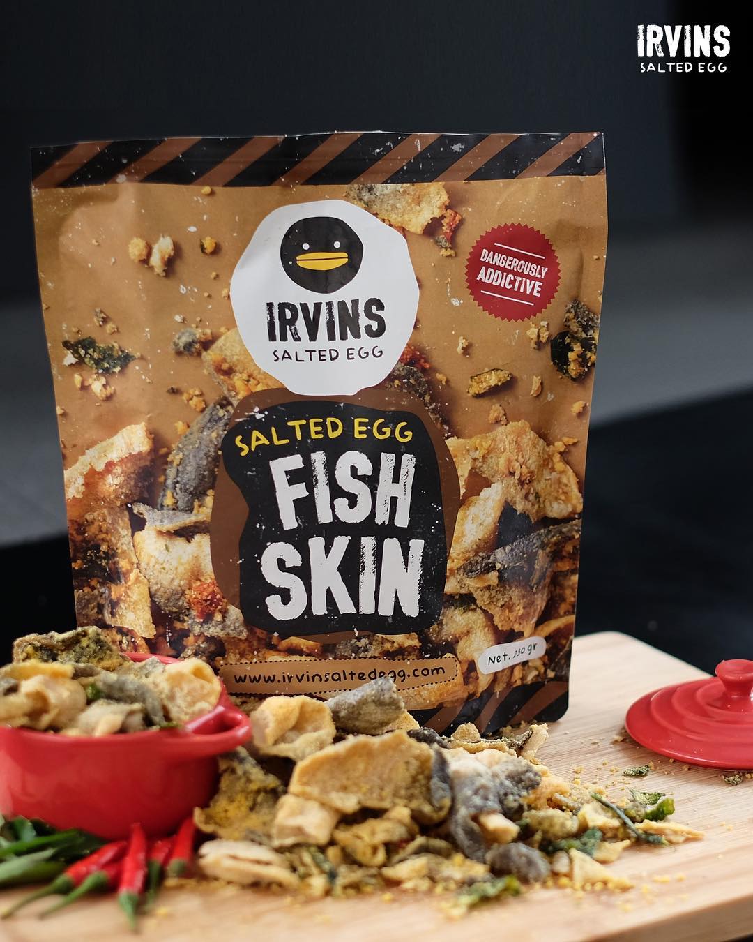 SIZE MỚI TOANH - 210G Irvins là loại snack được đánh giá là ngon nhất Singapore hiện nay đã có mặt tại Tiki! Da cá siêu giòn rụm, từng miếng thấm đậm trứng muối béo béo vị đậm đà cực kỳ đã. Da cá trứng muối thơm ngon, đậm đà được làm bằng chỉ da cá Pangasius tươi nhất và cao cấp nhất có nguồn gốc từ khu vực Châu Á Thái Bình Dương. Lòng đỏ trứng vịt muối là nguyên liệu quen thuộc thường được sử dụng trong các món ăn Châu Á, và IRVINS đã đưa nó lên một tầm cao mới. Phần da cá chiên giòn quyện với trứng muối thật thơm, lá cà ri thơm lừng, ớt đỏ rực tạo nên một trải nghiệm ăn vặt đa giác quan. Giòn. Giòn. Hương vị ngây ngất khiến bạn càng ăn càng nghiện! Made in Singapore.