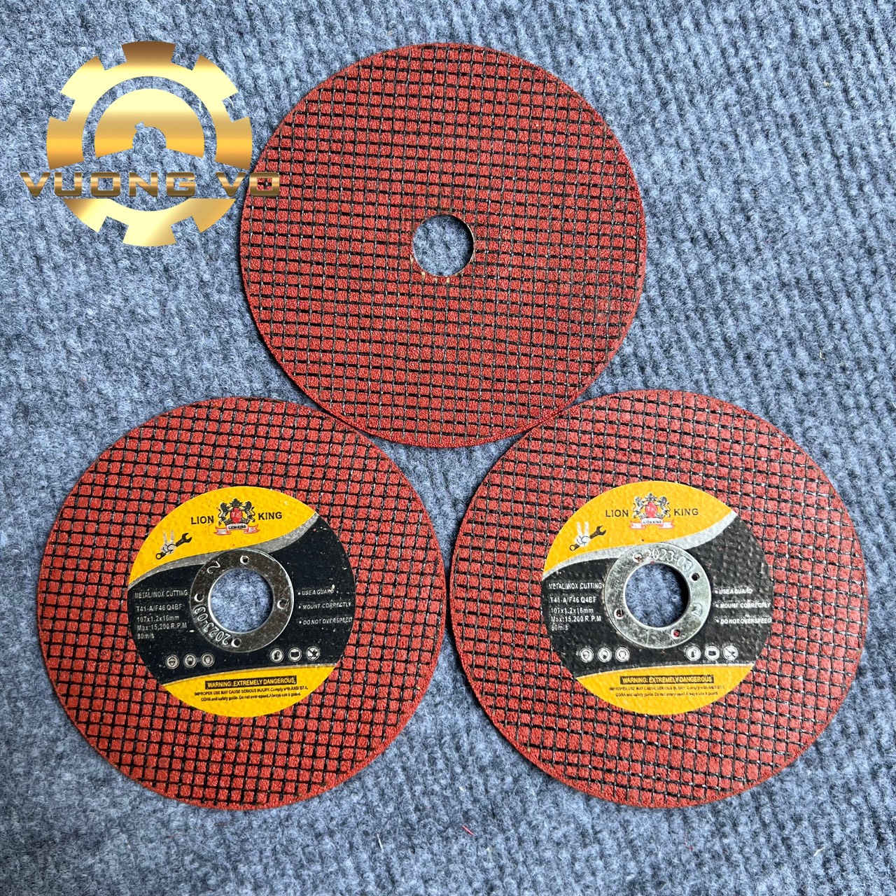 Tên sản phẩm: Đá cắt 100mm Thương hiệu: Lionking Kích thước: -Đường kính:107mm -Độ dày: 1.2mm -Đường kính cốt: 16mm Quy cách đống gói: -Lốc 25 viên -Hộp 100 viên Đá cắt Lionking được đánh
