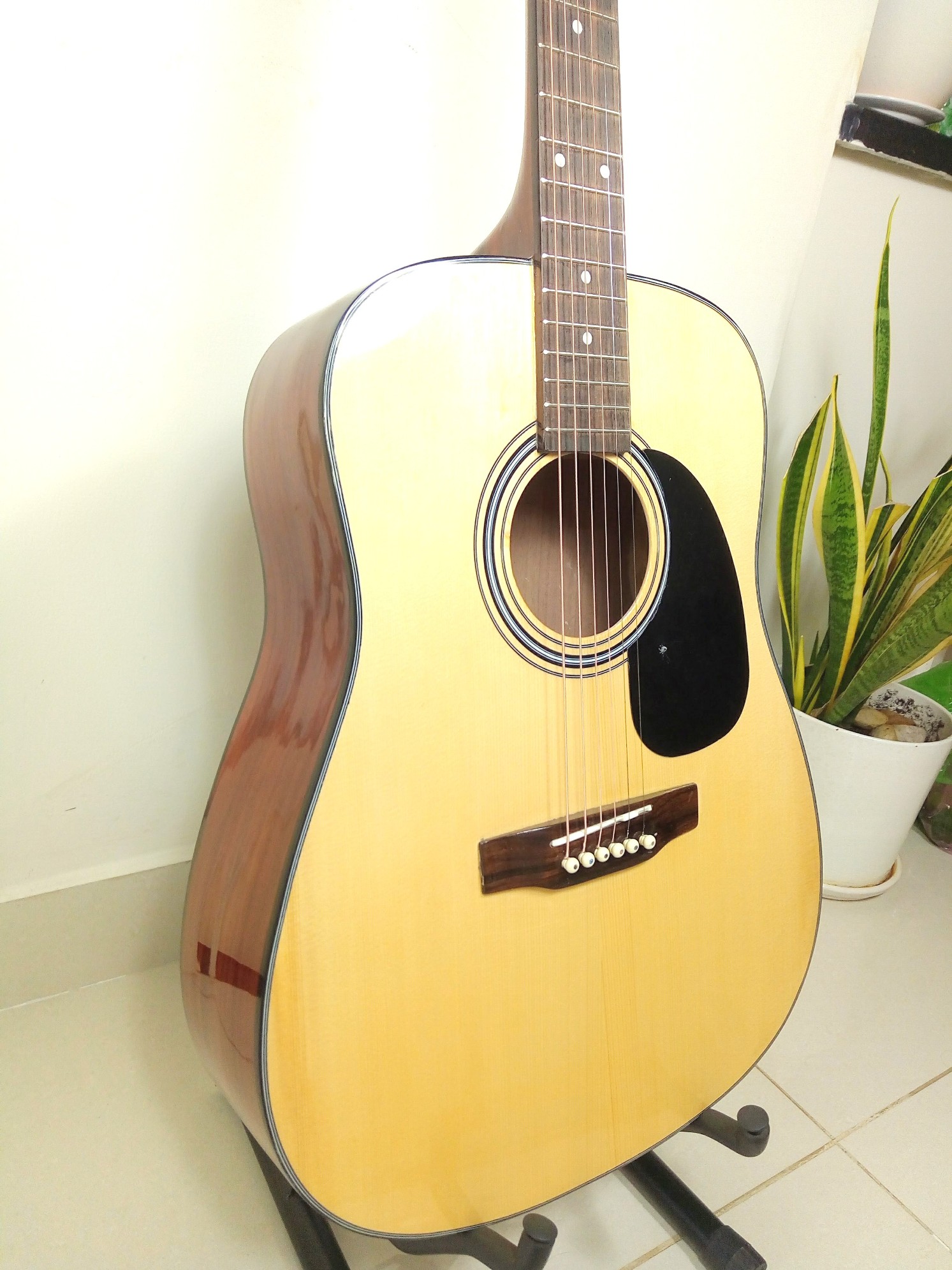 Guitar Acoustic là loại guitar dây sắt, phù hợp để chơi các thể loại nhạc trẻ, đệm hát... Dòng guitar Acoustic dành cho thị trường Thái Lan Mặt được làm bằng gỗ .Dòng đàn Guitar