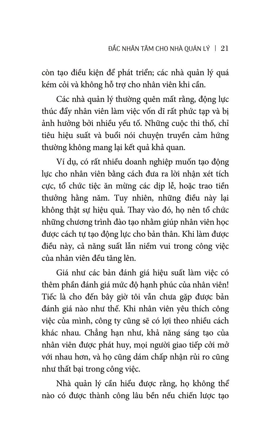 ĐẮC NHÂN TÂM CHO NHÀ QUẢN LÝ: THU PHỤC LÒNG NGƯỜI BẰNG TÂM VÀ TÀI Cả thế giới nói chung đã và đang trải qua nhiều cuộc khủng hoảng kinh tế. Mặc dù phần lớn nguyên nhân là do nạn tham nhũng, lòng tham của một số cá nhân trong giới tài chính và những vấn nạn liên quan, nhưng cũng không thể không đổ lỗi cho cách quản trị yếu kém của nhiều nhà quản lý. Phản ứng tức thời của hầu hết các công ty khi gặp khủng hoảng là sa thải hàng nghìn nhân viên – những người từng được xem là tài sản quý giá của tổ chức. Nếu quả thực lịch sử có xu hướng lặp lại, thì chỉ sau một năm, các công ty này sẽ phải tuyển lại toàn bộ nhân sự cho các vị trí mà họ đã sa thải với mức lương cao gấp đôi. Đắc nhân tâm cho nhà quản lý là phản ứng của tác giả Craig Nathanson trước cuộc khủng hoảng về năng lực quản lý. Chính vì năng lực yếu kém, cơ cấu tổ chức suy yếu và tư tưởng chú trọng thưởng phạt mà các nhà quản lý ngày nay đang bị gò bó trong chính cái hệ thống mà họ quản lý. Và hy vọng duy nhất của chúng ta là các nhà quản lý này sẽ được khai sáng, hoặc những nhà quản lý tương lai sẽ được đào tạo một cách bài bản hơn. Hãy nhớ lại một nhà quản lý mà bạn từng làm việc dưới trướng, người đã khiến cho bạn cảm thấy vui vẻ và tự hào về bản thân. Sự chuyển biến tích cực đó chính là sức ảnh hưởng của một nhà quản lý biết thu phục lòng người bằng tâm và tài. Quản lý vừa là một nghệ thuật vừa là một môn khoa học. Nhà quản lý giỏi sẽ quan tâm đến sự phát triển của cả tổ chức lẫn nhân viên. Họ còn biết ưu tiên hoàn thành những việc quan trọng nhất. Với Đắc nhân tâm cho nhà quản lý, mục tiêu của tác giả Craig Nathanson là cung cấp những công cụ và phương pháp vừa đơn giản vừa hiệu quả để cải thiện quá trình quản lý trong các tổ chức. Quyển sách sẽ là nguồn ý tưởng thiết thực cho những nhà quản lý còn non trẻ, các sinh viên ngành quản lý, và tất nhiên là, cho những nhà quản lý có thâm niên đang cần thêm ý tưởng mới. Các trích đoạn hay trong sách Đắc nhân tâm cho nhà quản lý Xét trên nhiều phương diện, vai trò quản lý đòi hỏi ở bạn khả năng của một cảnh sát giao thông xuất sắc: Luôn biết cách chỉ đạo, dẫn dắt, truyền động lực và duy trì nguồn cảm hứng cho nhân viên, đồng thời phải biết giải quyết vấn đề và kiểm soát cảm xúc của bản thân lẫn mọi người xung quanh.