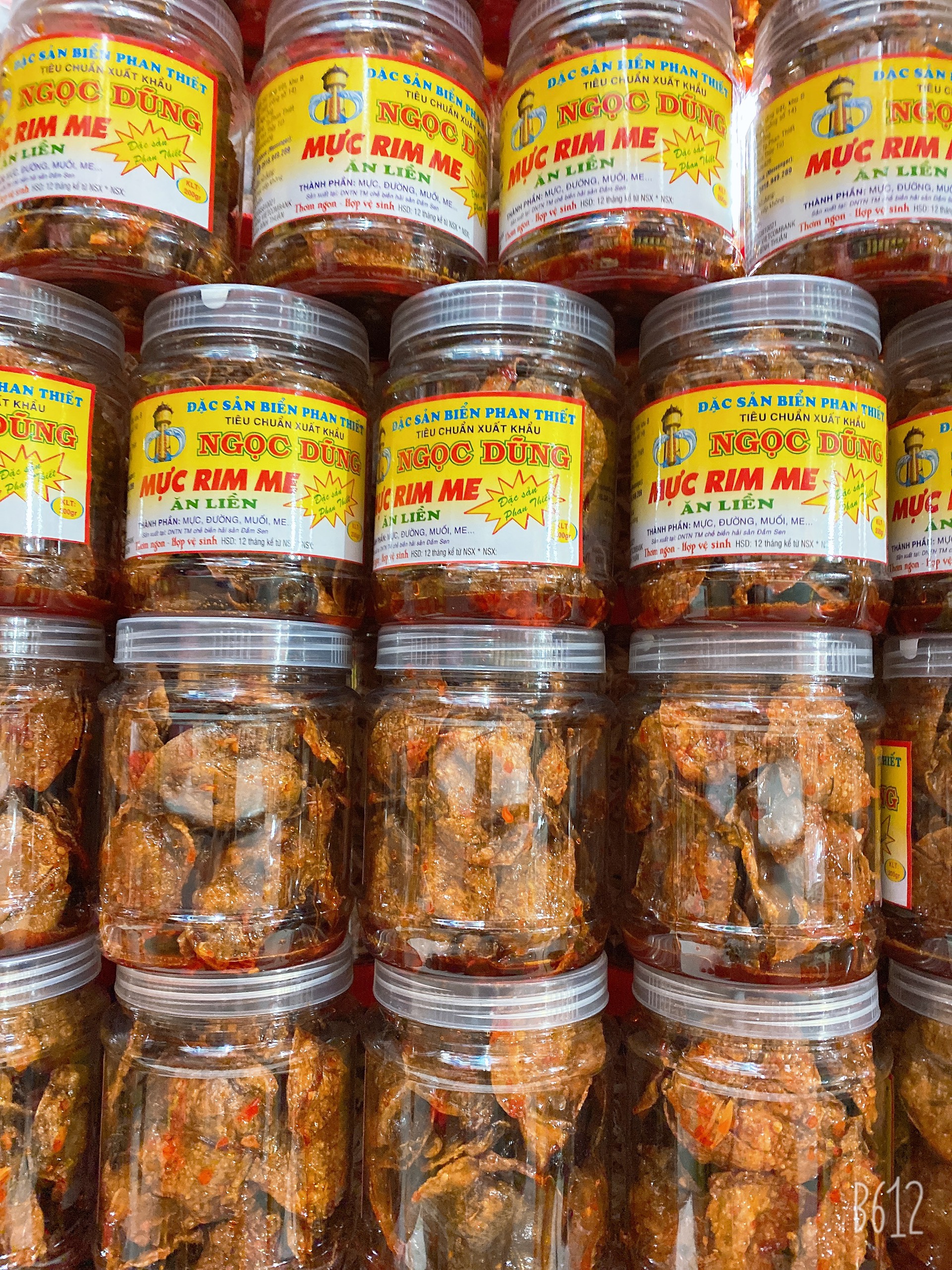 Mực rim me ( ăn liền ) hộp 250 gram được chế biến từ mực ống hay mực lá còn tươi xanh tại Cảng cá Phan Thiết tỉnh Bình Thuận là món ăn ngon của