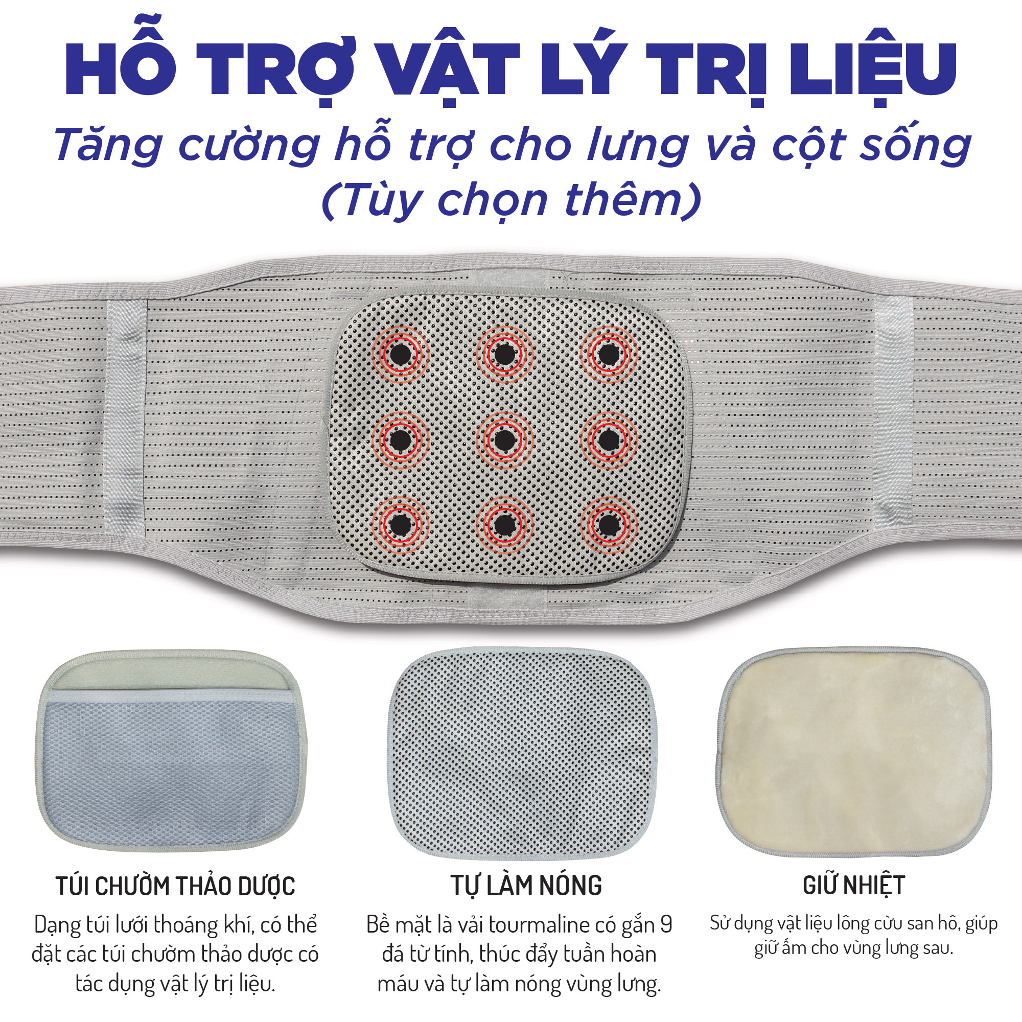 - LỰC KÉO 3D, KÉO GIÃN HAI TRỤC: 8 đai kéo composite, lực kéo chéo, giúp giảm áp lực xung quanh thắt lưng, làm dịu và sửa các đốt sống. Kết cấu đai kéo kép giúp người dùng thoải mái điều chỉnh lực nén vào cột sống, phù hợp với nhiều người hơn.