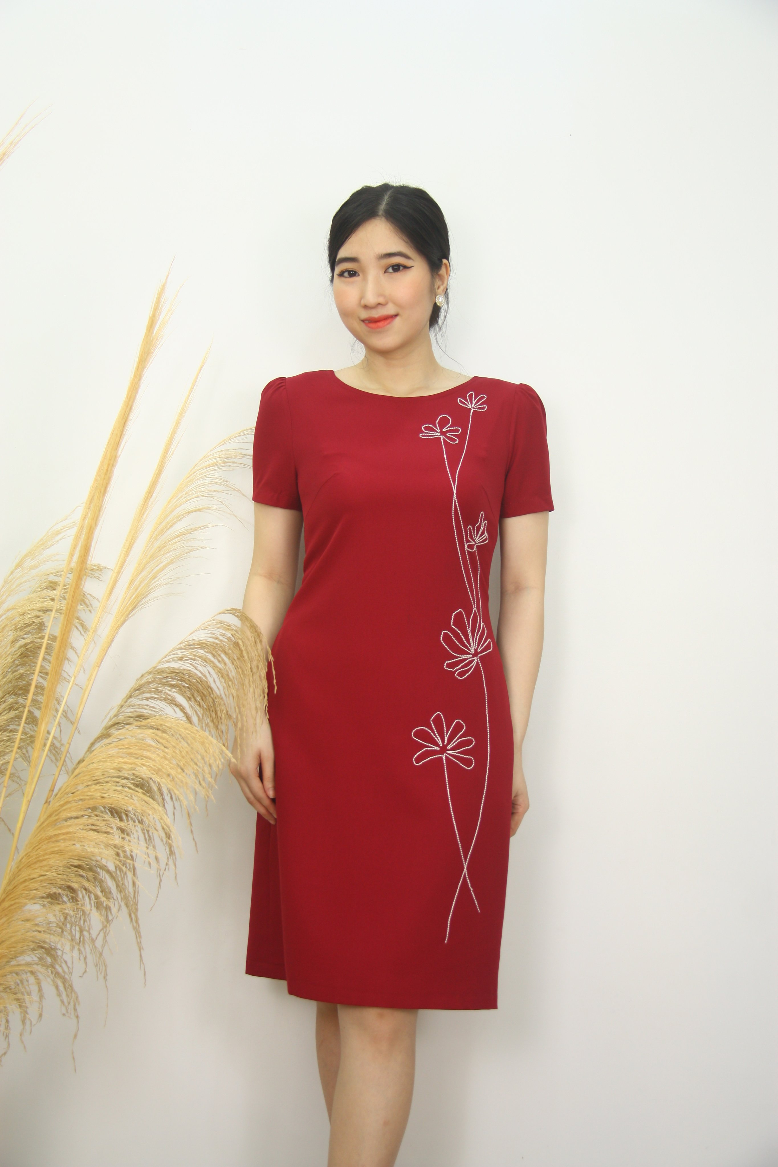- Thiết kế đầm dáng suông thoải mái dễ mặc, những chị có phần eo hơi tròn 1 chút thì không cần lo vì đầm thiết kế che bụng rất tinh tế. Hoa thêu độc đáo, sang trọng.
