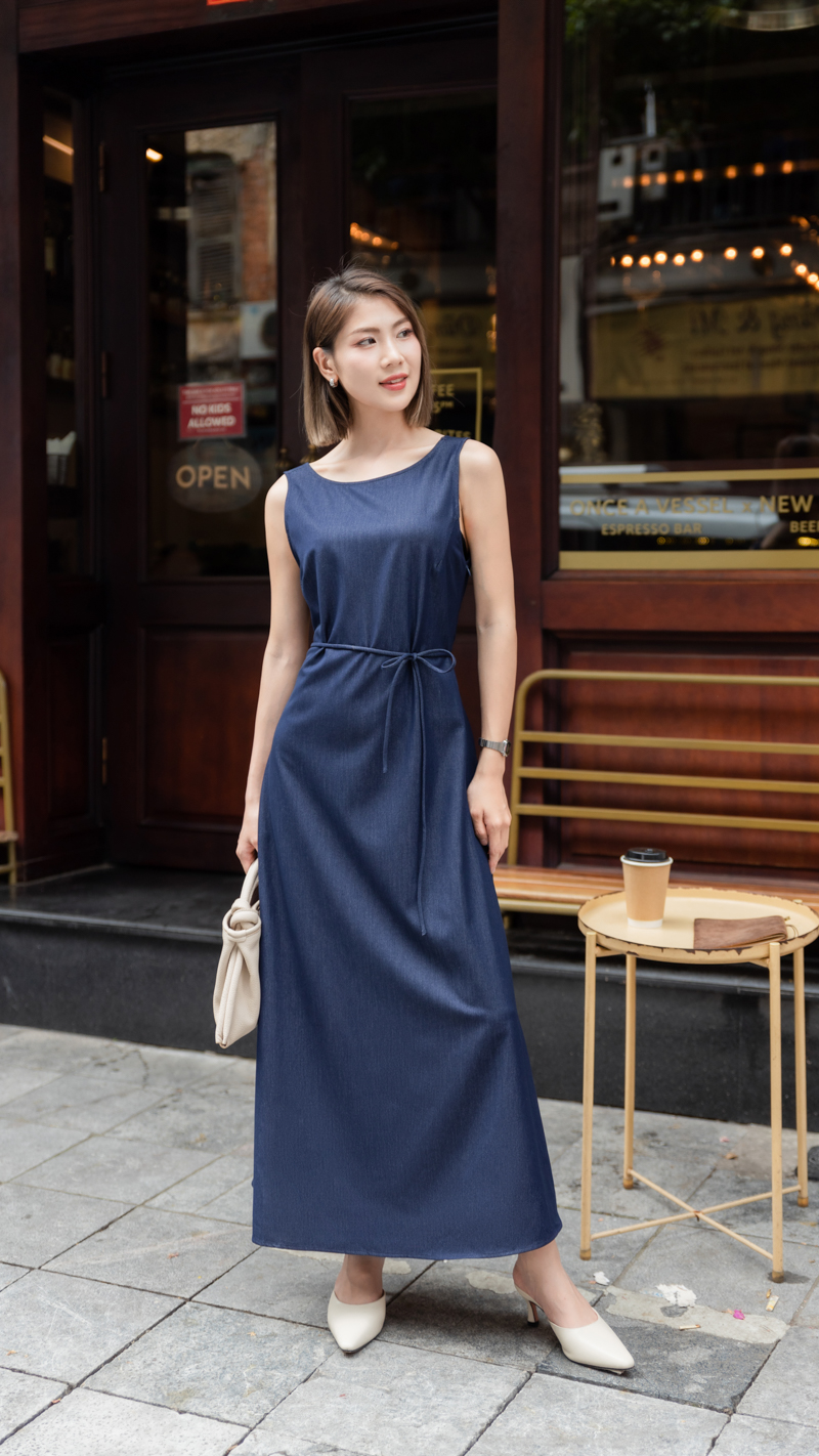 - chiếc đầm vải denim dáng dài với cấu trúc đơn giản, thoải mái che đi khuyết điểm trên cơ thể. Thiết kế có điểm nhấn 2 dây, Quý cô có thể tùy chỉnh mức độ chiết vòng eo nên phù hợp cho mọi dáng người. Chất liệu denim nhưng mềm mại, thoáng mát, co giãn nhẹ giúp nàng thoải mái dạo phố đi cafe với bạn bè, người thân.