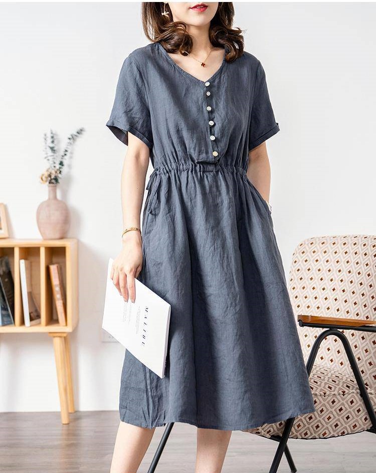 ✨Đầm linen dáng suông cổ V , Đầm sơ mi ngắn tay nhún eo, mặc đi chơi, đi làm Haint Boutique Da173