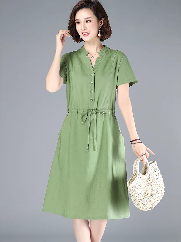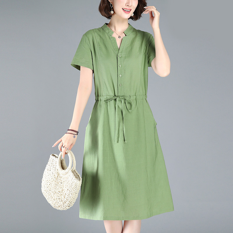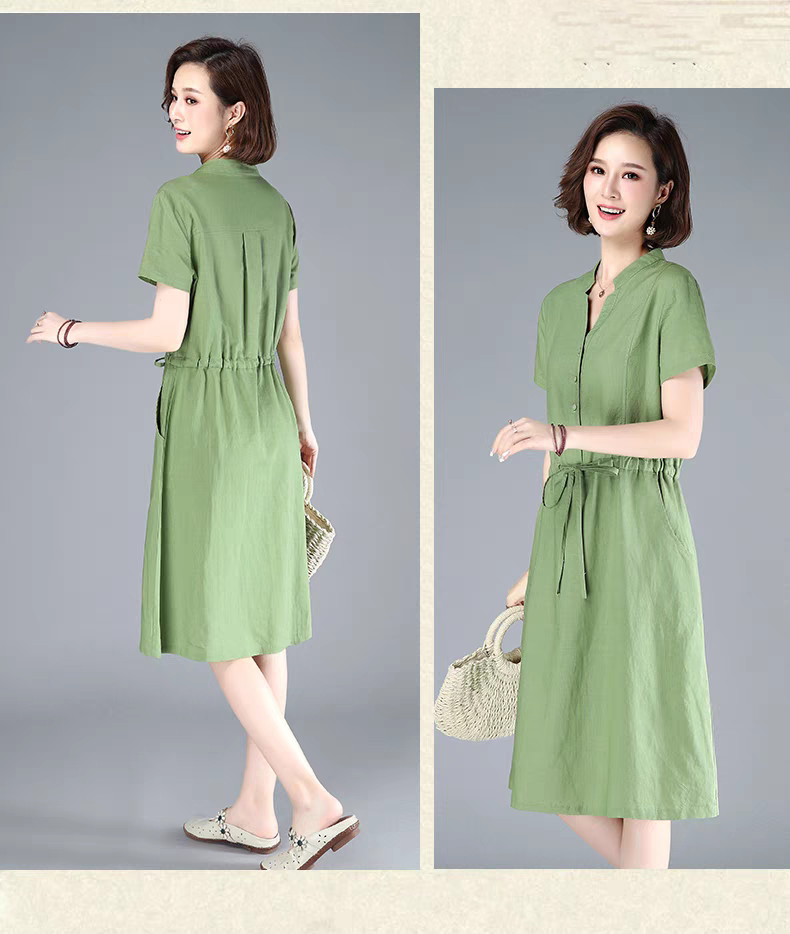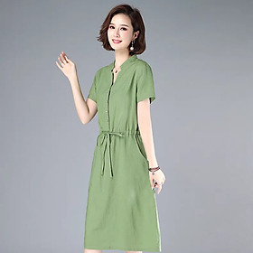 ✨Đầm Linen nữ dáng suông rút eo, Váy linen nữ công sở thiết kế cổ tàu ngắn tay thời trang nữ Haint Boutique