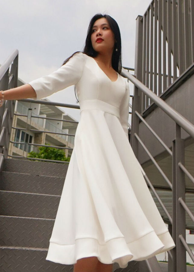 🔰 Đầm midi trắng cổ chữ V đuôi cá - VD5673 ềco📞092843 🏠 7//a ường 6 linh đôg, Thủ Đức