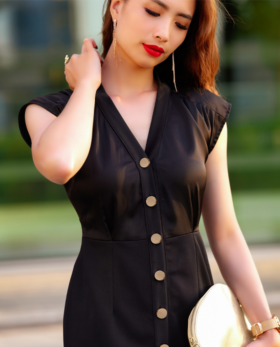 Đầm Ôm DRE084 Cosmos Đen Huyền Bí Thời trang thiết kế HityKiểu dáng đầm ôm eo, ôm mông bút chìThân trên cổ V tay liềnCài bằng hàng nút đen bọc vàng ánh kim nổi bật phía trước Phụ nữ biết yêu chín...