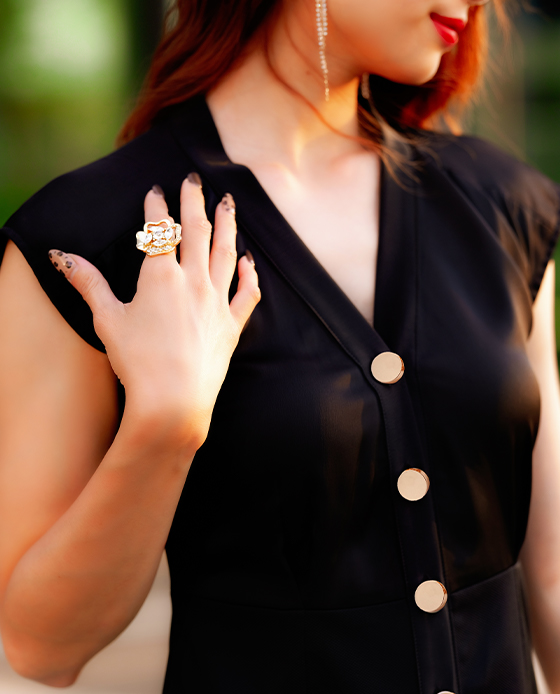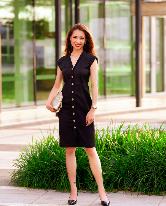 Đầm Ôm DRE084 Cosmos Đen Huyền Bí Thời trang thiết kế Hity Kiểu dáng đầm ôm eo, ôm mông bút chì Thân trên cổ V tay liền Cài bằng hàng nút đen bọc vàng ánh kim nổi bật phía trước  Phụ nữ biết yêu chính bản thân mình ai cũng muốn khoác lên những bộ cánh đẹp. Đó chẳng phải để khoe hay chứng tỏ, mà đơn thuần là họ biết chìu chuộng bản thân và biết bắt kịp hơi thở thời trang thịnh hành. Hiển nhiên dù là ở thuở xuân thì nào, chồng con ra sao, mặc đẹp chẳng bao giờ là sai. Thế nên sao không thử một lần chơi lớn để xem mọi người có trầm trồ không? Chiếc đầm phối satin đen quyền năng mang đến cho nàng sức mạnh tiếp thêm tự tin trong cuộc sống. Mặc đẹp để quên những mệt nhọc và áp lực cuộc sống. Mặc đẹp để tự tin làm chủ cuộc đời mình.  CHẤT LIỆU Thân trên chất liệu Lụa Satin cao cấp Thân dưới Polyester Spandex độ co giãn 5% Cắt may thủ công tinh tế tại Nha Trang, Việt Nam