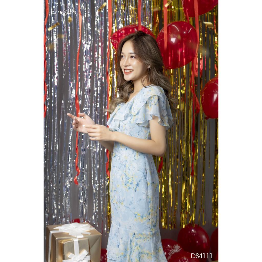 "Đầm ôm xếp tầng Emspo Milestone, cổ V viền bèo DS4111 Đầm được thiết kế trên chất liệu Chiffon họa tiết cao cấp Đầm có điểm nhấn là phần bèo cổ và phần chân váy