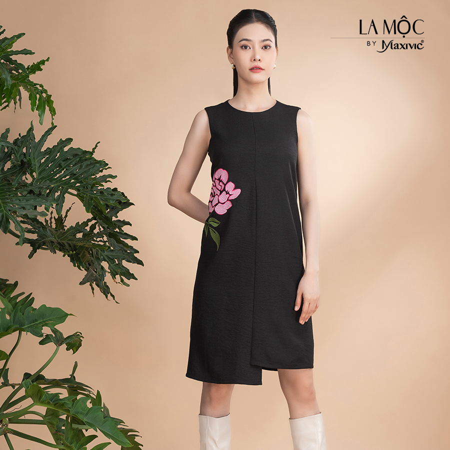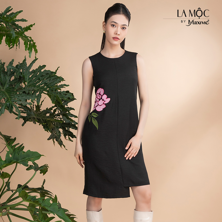 Đầm sát nách dáng xòe kẹp viền ren cổ và dọc thân trước đính hoa lụa rủ L451009 | Thời Trang FIONA