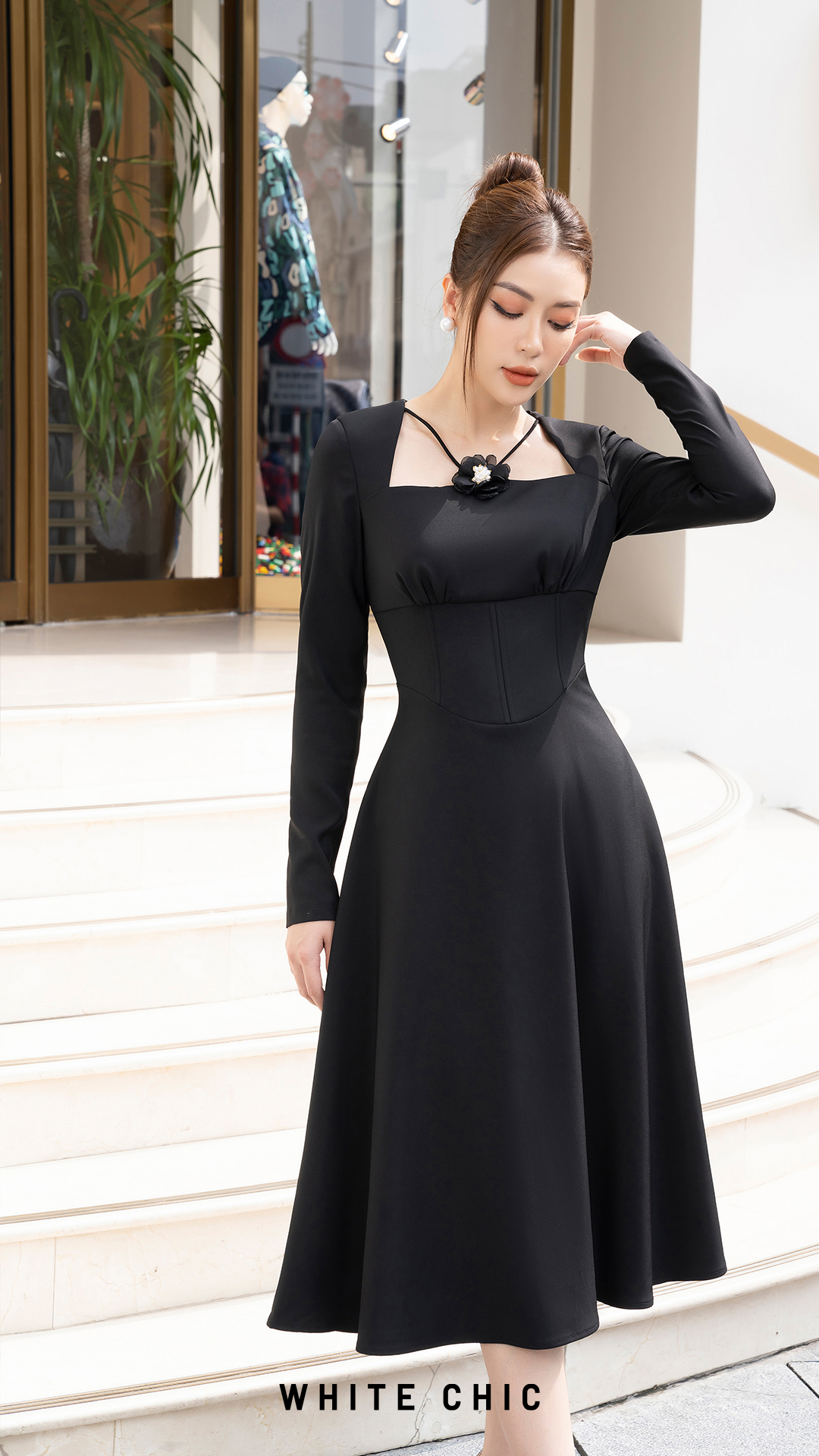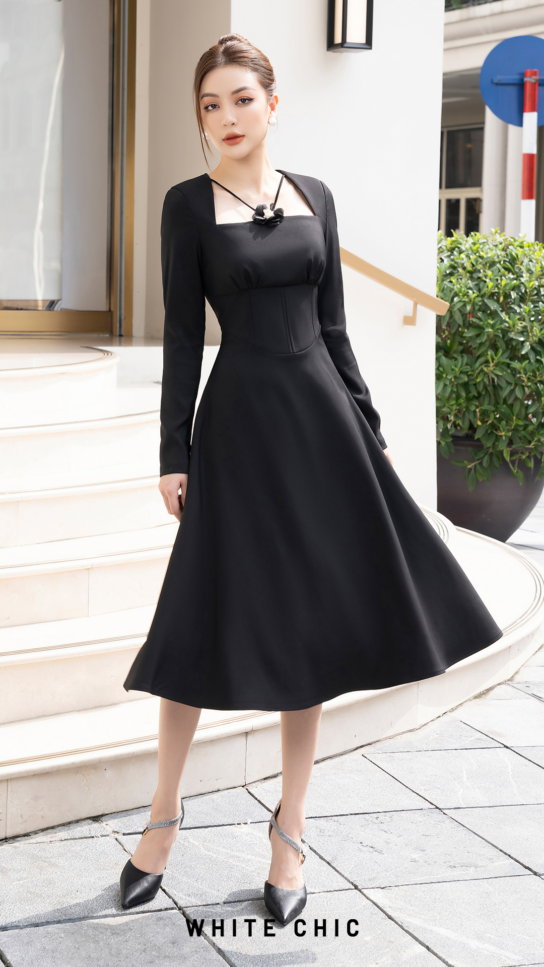 ✨Đầm xòe dài tay màu đen Crepuscolo Thiết kế cao cấp WHITE CHIC