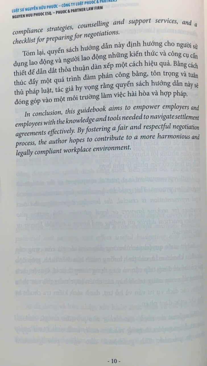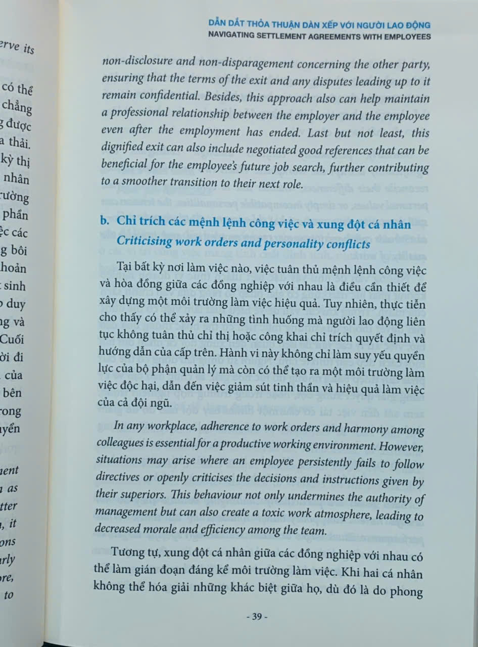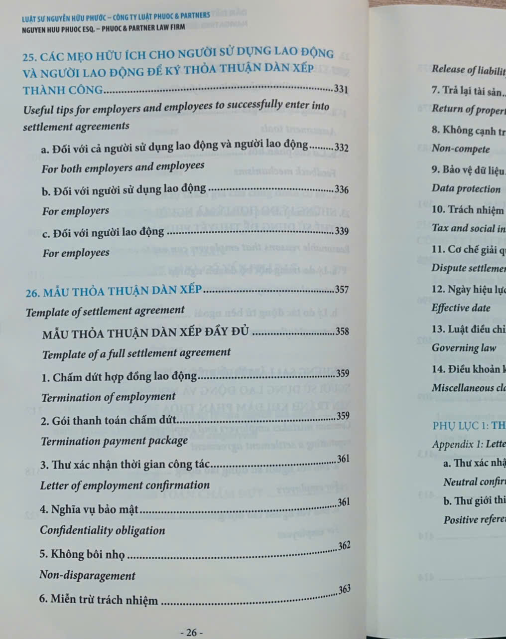 Sách - Dẫn Dắt Thỏa Thuận Dàn Xếp Với Người Lao Động - Navigating settlement agreements Tác giả: Luật sư Nguyễn Hữu Phước Ngày xuất bản: 5.2025 NXB: Tổng hợp TP.HCM Khổ: 15,5*23cm Số trang: 426 Giá bìa: 329.000 đồng Công ty phát hành: Nhà xuất bản Chính trị Quốc gia Sự thật Giới thiệu- Introduction Quyển sách Dẫn Dắt Thỏa Thuận Dàn Xếp Với Người Lao Động là hướng dẫn toàn diện được thiết kế nhằm hỗ trợ người sử dụng lao động và người lao động trong việc hiểu rõ và xử lý những phức tạp của quá trình đàm phán thỏa thuận dàn xếp sao cho hiệu quả. Quyển sách này đi sâu vào tính đa diện của thỏa thuận dàn xếp, cung cấp những giải thích rõ ràng, các bước thực tiễn và những góc nhìn giá trị nhằm giúp độc giả có thể tự mình dẫn dắt sự phức tạp của quá trình này. Navigating settlement agreements with employees is a comprehensive guide designed to assist both employers and employees in understanding and effectively handling the complexities of settlement negotiations. This guidebook delves into the multifaceted nature of settlement agreements, offering clear explanations, practical steps, and valuable insights to help readers themselves navigate the intricacies of this process. Thỏa thuận dàn xếp, thường được biết đến với các tên gọi khác nhau như thỏa thuận thôi việc hay thỏa thuận chấm dứt, là tài liệu pháp lý có tính chất ràng buộc, quy định các điều khoản về việc người lao động rời khỏi tổ chức. Thỏa thuận này có thể xuất phát từ nhiều hoàn cảnh khác nhau, bao gồm các vấn đề có liên quan đến kỷ luật lao động, hiệu suất làm việc, tái cơ cấu tổ chức hoặc thỏa thuận chung giữa hai bên. Việc hiểu rõ lý do dẫn đến thỏa thuận này và khung pháp lý điều chỉnh là rất quan trọng để đảm bảo việc dàn xếp được thực hiện một cách công bằng và ôn hòa cho cả hai bên. Settlement agreements, often referred to as severance agreements or termination agreements, are legally binding documents that outline the terms of an employee's departure from an organisation. These agreements can arise from various circumstances, including disciplinary actions, performance issues, organisational restructuring, or mutual agreement. Understanding the reasons behind these agreements and the legal framework governing them is vital for both parties to ensure fair and amicable resolutions. Quyển sách hướng dẫn này bắt đầu bằng việc khám phá một câu hỏi đơn giản: “Thỏa thuận dàn xếp là gì?” và tiếp tục xem xét các tình huống khác nhau có thể dẫn đến nhu cầu của một thỏa thuận như vậy. Từ vấn đề kỷ luật lao động, xung đột lợi ích cá nhân đến dư thừa lao động hay các vấn đề về sức khỏe của người lao động, quyển sách này trình bày những giải thích chi tiết về các yếu tố có thể dẫn đến một thỏa thuận dàn xếp. Quyển sách này cũng thảo luận về khung pháp lý, xu hướng hiện tại và các vấn đề quốc tế, đảm bảo sự hiểu biết toàn diện và đa chiều về chủ đề thú vị này. This guidebook begins by exploring the fundamental question: "What is a settlement agreement?" and proceeds to examine the various scenarios that can lead to the need for such agreements. From disciplinary actions and personality conflicts to redundancy and employee health issues, it provides detailed explanations of the factors that may necessitate a settlement agreement. This guidebook also discusses the legal framework, current trends, and international considerations, ensuring a comprehensive and multidimensional understanding of this interesting topic. Một trong những phần quan trọng của quyển sách hướng dẫn này là tập trung vào lợi ích của thỏa thuận dàn xếp đối với cả người sử dụng lao động và người lao động. Bằng việc nêu bật những lợi ích như tiết kiệm chi phí, tuân thủ pháp luật và duy trì mối quan hệ tích cực, quyển sách hướng dẫn này nhấn mạnh đến tầm quan trọng của thỏa thuận này trong việc thúc đẩy môi trường làm việc công bằng và tôn trọng lẫn nhau. One of the key sections of this guidebook focuses on the benefits of settlement agreements for both employers and employees. By highlighting the advantages, such as cost savings, legal compliance, and maintaining positive relationships, it aims to emphasize the importance of these agreements in fostering a fair and respectful workplace environment. Ngoài những kiến thức lý thuyết, quyển sách hướng dẫn này còn giới thiệu các bước thực tiễn trong việc đàm phán thỏa thuận dàn xếp. Quyển sách hướng dẫn này đưa ra phương pháp tiếp cận theo từng bước, từ lời mời họp ban đầu đến hoàn tất thỏa thuận, đảm bảo độc giả sẽ được trang bị đầy đủ để có thể xử lý qua từng giai đoạn của quá trình này. Quyển sách hướng dẫn này cũng đi sâu vào nội dung của thỏa thuận dàn xếp, nêu rõ các thành phần thiết yếu và thảo luận về việc làm thế nào để một thỏa thuận dàn xếp được xem là công bằng cho các bên. Bên cạnh đó, quyển sách hướng dẫn này còn đưa ra một số lý do hợp lý để người sử dụng lao động thuyết phục người lao động đồng ý với đề nghị dàn xếp của mình. Hơn thế nữa, quyển sách