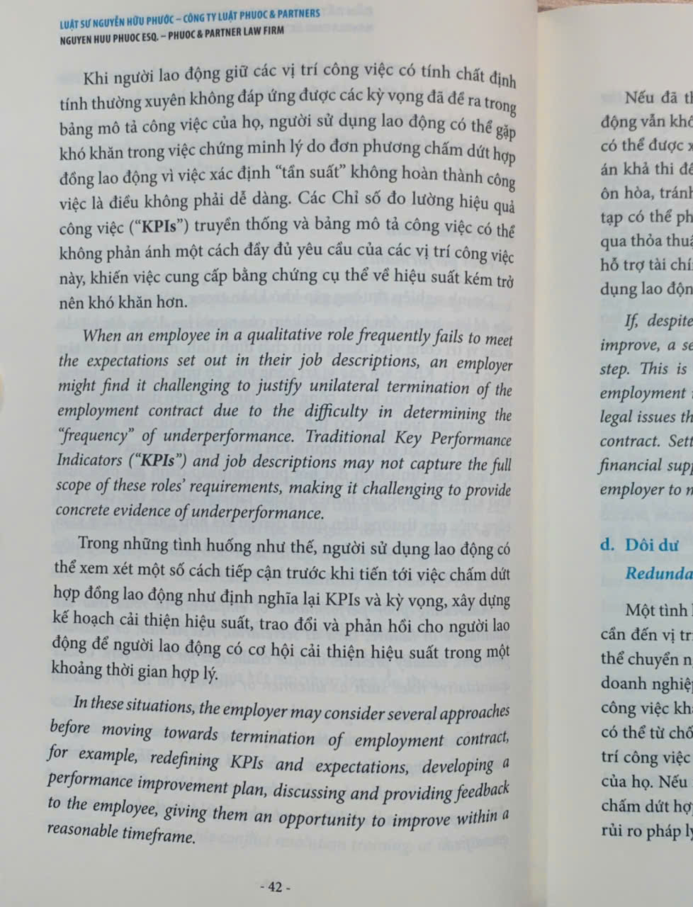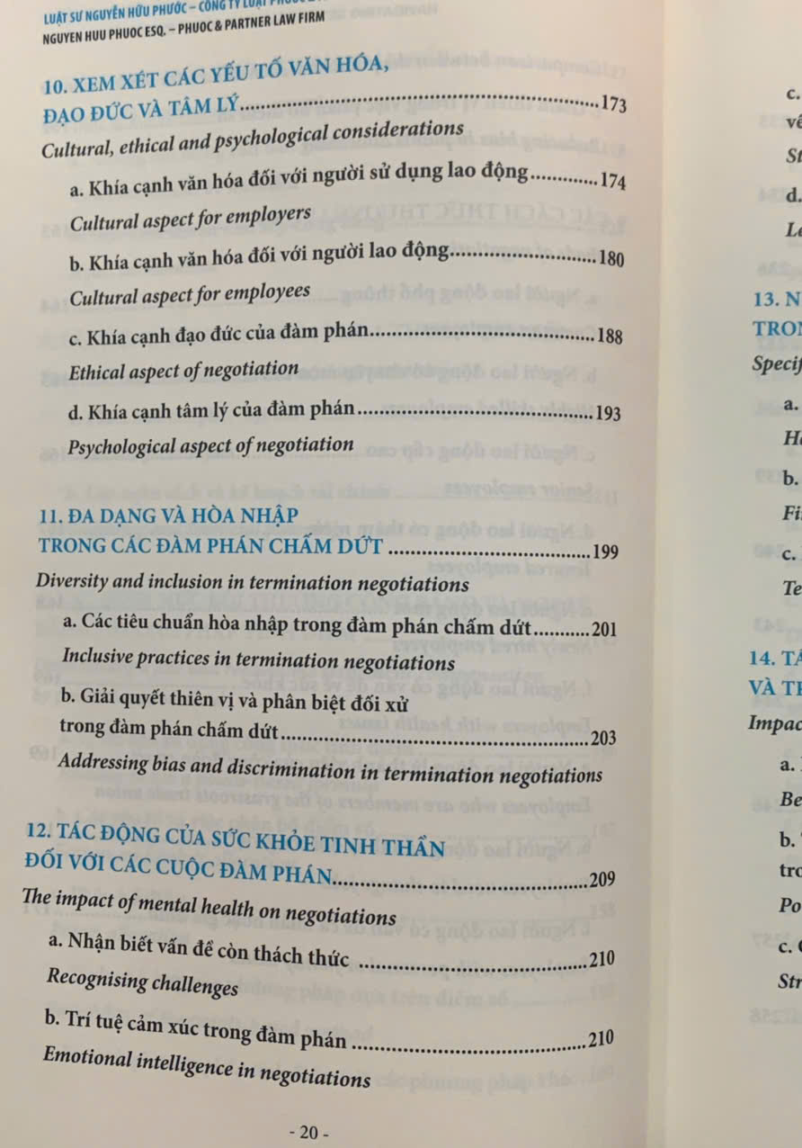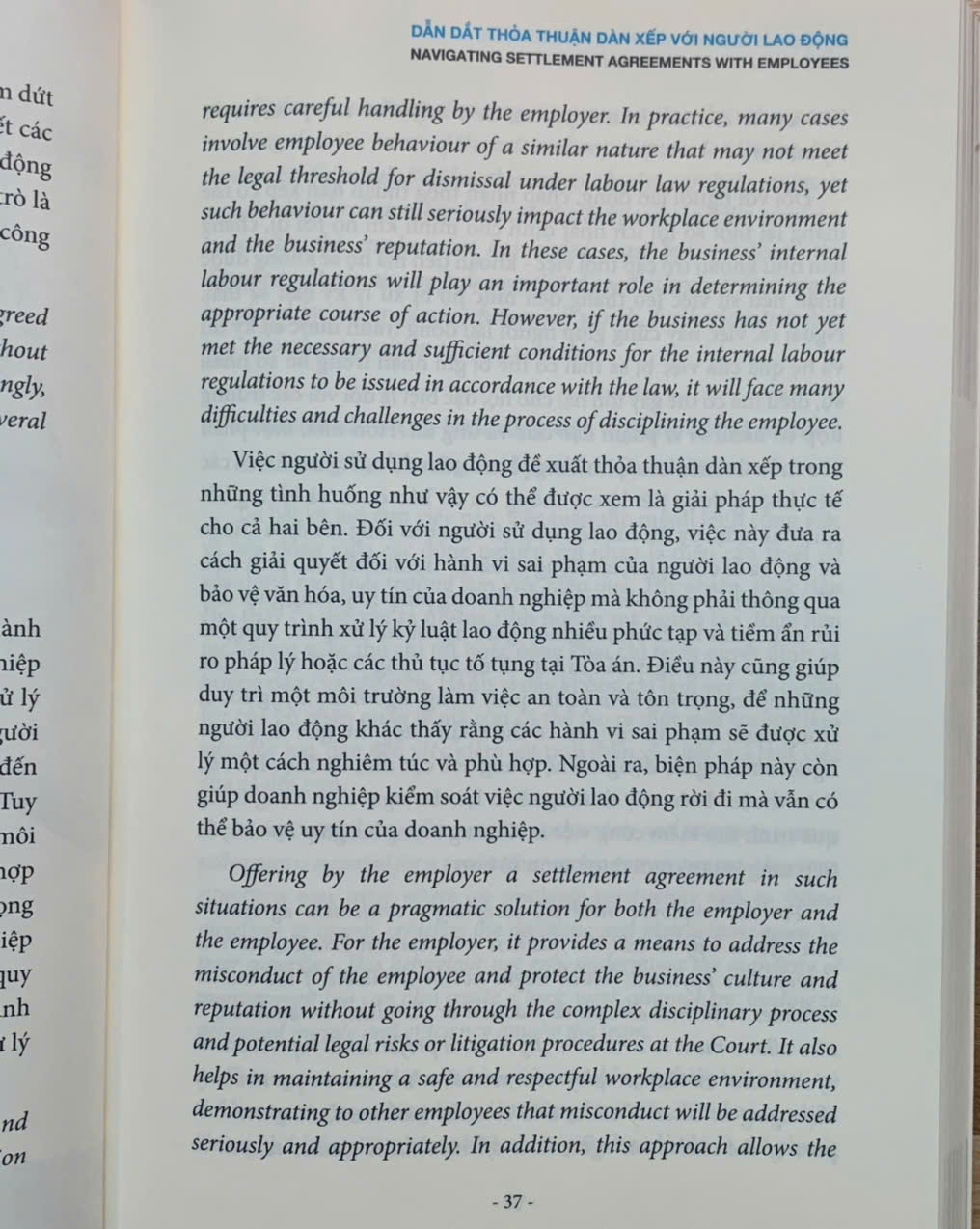 Sách - Dẫn Dắt Thỏa Thuận Dàn Xếp Với Người Lao Động - Navigating settlement agreements Tác giả: Luật sư Nguyễn Hữu Phước Ngày xuất bản: 5.2025 NXB: Tổng hợp TP.HCM Khổ: 15,5*23cm Số trang: 426 Giá bìa: 329.000 đồng Công ty phát hành: Nhà xuất bản Chính trị Quốc gia Sự thật Giới thiệu- Introduction Quyển sách Dẫn Dắt Thỏa Thuận Dàn Xếp Với Người Lao Động là hướng dẫn toàn diện được thiết kế nhằm hỗ trợ người sử dụng lao động và người lao động trong việc hiểu rõ và xử lý những phức tạp của quá trình đàm phán thỏa thuận dàn xếp sao cho hiệu quả. Quyển sách này đi sâu vào tính đa diện của thỏa thuận dàn xếp, cung cấp những giải thích rõ ràng, các bước thực tiễn và những góc nhìn giá trị nhằm giúp độc giả có thể tự mình dẫn dắt sự phức tạp của quá trình này. Navigating settlement agreements with employees is a comprehensive guide designed to assist both employers and employees in understanding and effectively handling the complexities of settlement negotiations. This guidebook delves into the multifaceted nature of settlement agreements, offering clear explanations, practical steps, and valuable insights to help readers themselves navigate the intricacies of this process. Thỏa thuận dàn xếp, thường được biết đến với các tên gọi khác nhau như thỏa thuận thôi việc hay thỏa thuận chấm dứt, là tài liệu pháp lý có tính chất ràng buộc, quy định các điều khoản về việc người lao động rời khỏi tổ chức. Thỏa thuận này có thể xuất phát từ nhiều hoàn cảnh khác nhau, bao gồm các vấn đề có liên quan đến kỷ luật lao động, hiệu suất làm việc, tái cơ cấu tổ chức hoặc thỏa thuận chung giữa hai bên. Việc hiểu rõ lý do dẫn đến thỏa thuận này và khung pháp lý điều chỉnh là rất quan trọng để đảm bảo việc dàn xếp được thực hiện một cách công bằng và ôn hòa cho cả hai bên. Settlement agreements, often referred to as severance agreements or termination agreements, are legally binding documents that outline the terms of an employee's departure from an organisation. These agreements can arise from various circumstances, including disciplinary actions, performance issues, organisational restructuring, or mutual agreement. Understanding the reasons behind these agreements and the legal framework governing them is vital for both parties to ensure fair and amicable resolutions. Quyển sách hướng dẫn này bắt đầu bằng việc khám phá một câu hỏi đơn giản: “Thỏa thuận dàn xếp là gì?” và tiếp tục xem xét các tình huống khác nhau có thể dẫn đến nhu cầu của một thỏa thuận như vậy. Từ vấn đề kỷ luật lao động, xung đột lợi ích cá nhân đến dư thừa lao động hay các vấn đề về sức khỏe của người lao động, quyển sách này trình bày những giải thích chi tiết về các yếu tố có thể dẫn đến một thỏa thuận dàn xếp. Quyển sách này cũng thảo luận về khung pháp lý, xu hướng hiện tại và các vấn đề quốc tế, đảm bảo sự hiểu biết toàn diện và đa chiều về chủ đề thú vị này. This guidebook begins by exploring the fundamental question: "What is a settlement agreement?" and proceeds to examine the various scenarios that can lead to the need for such agreements. From disciplinary actions and personality conflicts to redundancy and employee health issues, it provides detailed explanations of the factors that may necessitate a settlement agreement. This guidebook also discusses the legal framework, current trends, and international considerations, ensuring a comprehensive and multidimensional understanding of this interesting topic. Một trong những phần quan trọng của quyển sách hướng dẫn này là tập trung vào lợi ích của thỏa thuận dàn xếp đối với cả người sử dụng lao động và người lao động. Bằng việc nêu bật những lợi ích như tiết kiệm chi phí, tuân thủ pháp luật và duy trì mối quan hệ tích cực, quyển sách hướng dẫn này nhấn mạnh đến tầm quan trọng của thỏa thuận này trong việc thúc đẩy môi trường làm việc công bằng và tôn trọng lẫn nhau. One of the key sections of this guidebook focuses on the benefits of settlement agreements for both employers and employees. By highlighting the advantages, such as cost savings, legal compliance, and maintaining positive relationships, it aims to emphasize the importance of these agreements in fostering a fair and respectful workplace environment. Ngoài những kiến thức lý thuyết, quyển sách hướng dẫn này còn giới thiệu các bước thực tiễn trong việc đàm phán thỏa thuận dàn xếp. Quyển sách hướng dẫn này đưa ra phương pháp tiếp cận theo từng bước, từ lời mời họp ban đầu đến hoàn tất thỏa thuận, đảm bảo độc giả sẽ được trang bị đầy đủ để có thể xử lý qua từng giai đoạn của quá trình này. Quyển sách hướng dẫn này cũng đi sâu vào nội dung của thỏa thuận dàn xếp, nêu rõ các thành phần thiết yếu và thảo luận về việc làm thế nào để một thỏa thuận dàn xếp được xem là công bằng cho các bên. Bên cạnh đó, quyển sách hướng dẫn này còn đưa ra một số lý do hợp lý để người sử dụng lao động thuyết phục người lao động đồng ý với đề nghị dàn xếp của mình. Hơn thế nữa, quyển sách