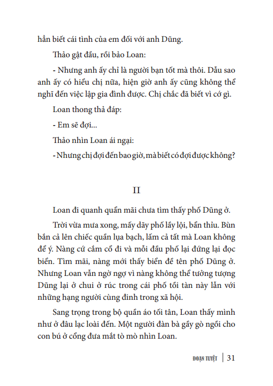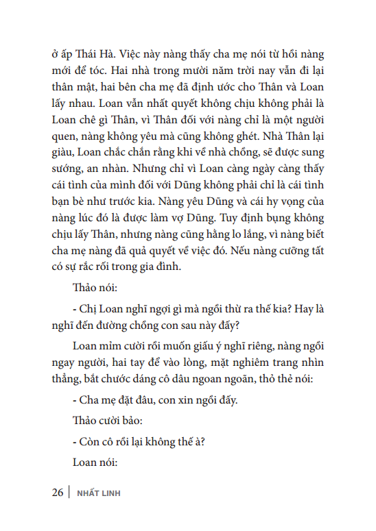 Sức mạnh trí tuệ ở Loan, không gì khác, là đã phát hiện, chỉ mặt những tác nhân gây đau khổ, dù đến cùng hay nửa vời, để không rơi vào tình cảnh mê muội chấp nhận mọi phi lí, ngang trái. Để học vấn mới lên ngôi, chỗ đứng của người phụ nữ sẽ rộng hơn rất nhiều so với vị trí con người nạn nhân như trước. Và không có gì hợp lí, thuyết phục cho bằng việc tìm chỗ đứng ấy ngay trong gia đình, nơi người phụ nữ vốn chỉ được đóng vai người sinh nở, hầu hạ gia đình chồng và là đích ngắm cho các sợi dây nghĩa vụ phi nhân thòng vào.