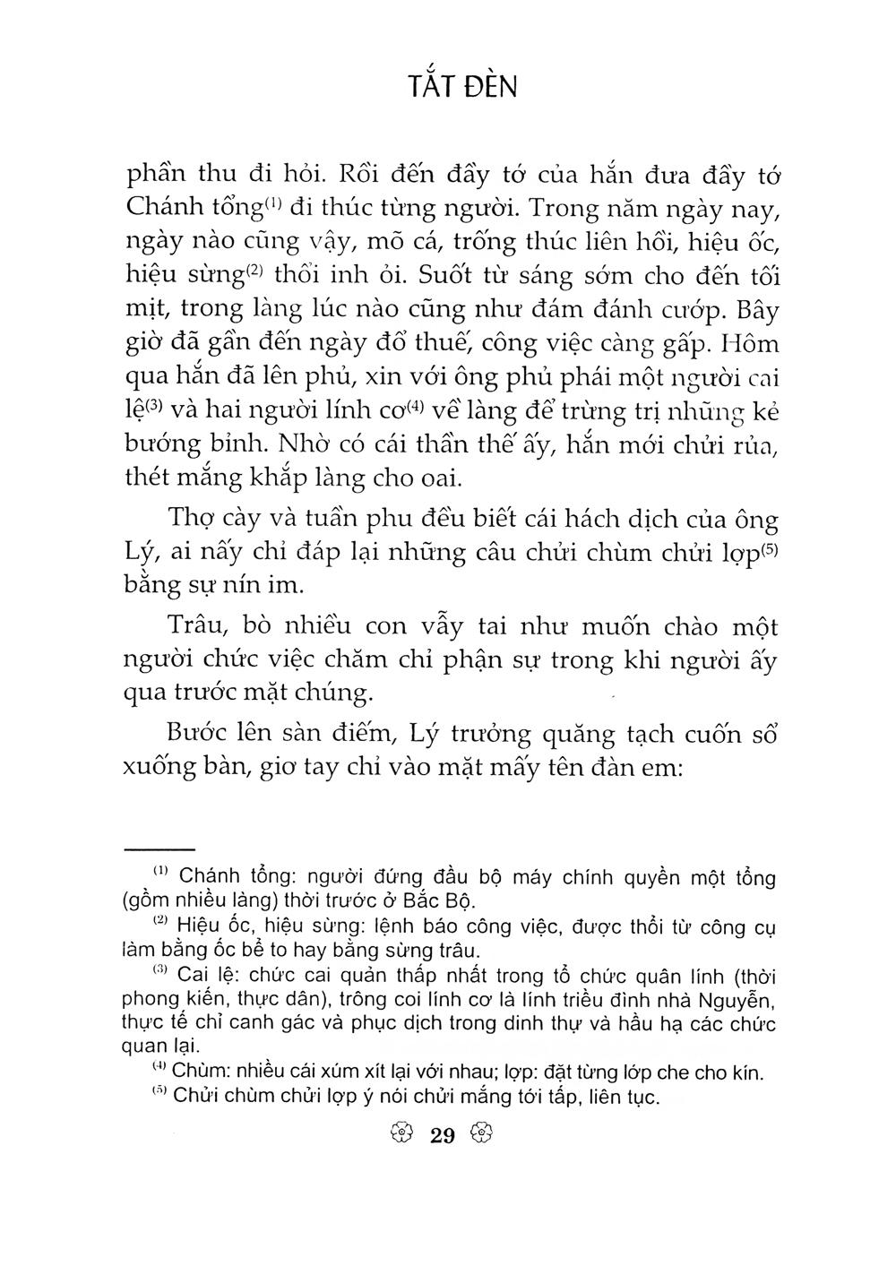 "Theo tôi tiên tri, thì cuốn Tắt đèn còn phải sống lâu thọ hơn cả một số văn gia đương kim hôm nay. Chị Dậu, đích là tác giả Ngô Tất Tố hóa thân ra mà thôi. Chị Dậu là cái đốm sáng đặc biệt của Tắt đèn. Nếu ví toàn truyện Tắt đèn là một khóm cây thì chị Dậu là cả gốc cả ngọn cả cành, và chính chị Dậu đã nổi gió lên mà rung cho cả cái cây dạ hương Tắt đèn đó lên."