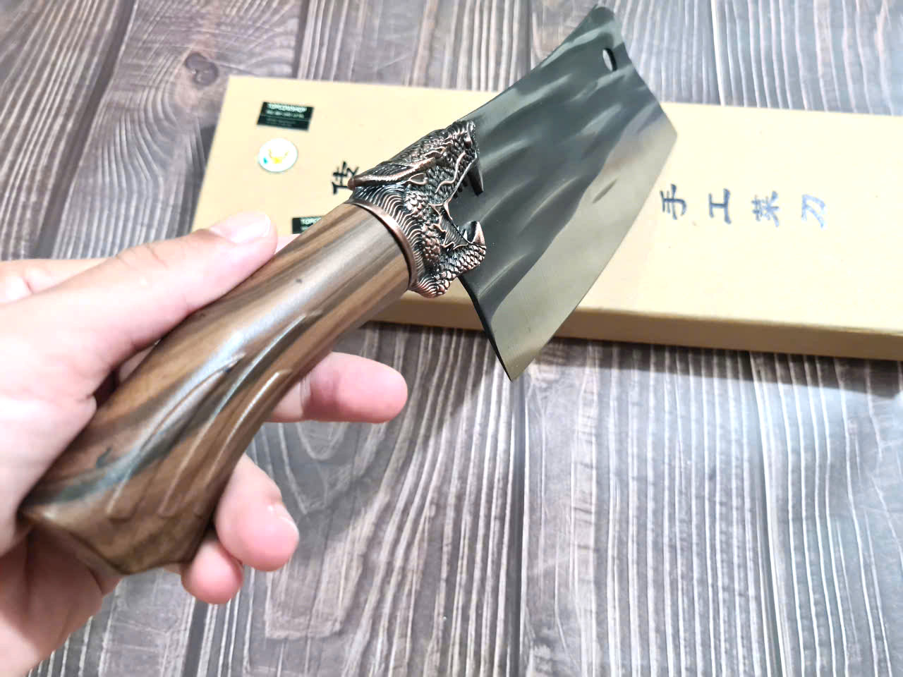 - Chức năng: Chặt xương ống, chân giò, trâu bò - Kích thước: Lưỡi: 22cm, cán: 10cm, rộng: 10cm, dầy: 5ly, trọng lượng: 800g - Cán : Gỗ mun, Khâu đồng đỏ , chốt đinh
