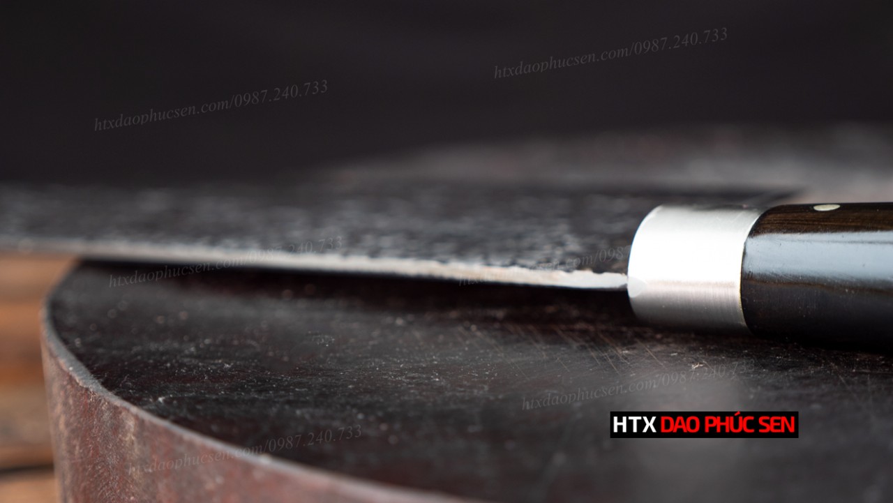 Dao chặt gà sắc bén - Thép nhíp ô tô - Cán mun khâu inox - N09TM Lựa chọn nguyên liệu 100% là nhíp ô tô ( Liên xô, Ifa ) được các thợ rèn giỏi gia công tỉ mỉ từ lưỡi dao cho đến cán dao đảm bảo việc băm chặt xương sắc - ngọt. Các sản phẩm của HTX Dao Phúc Sen thợ rèn đều sử dụng than củi khi nung thép cũng như tôi dao để đảm bảo lưỡi dao khi ra lò sắc bén và bền lâu. Nét đặc biệt của mẫu dao này là bề mặt lưỡi dao được thợ rèn giỏi của HTX Dao Phúc Sen đập rèn hoa văn tỉ mỉ đẹp mắt tạo nét khác biệt cho từng con dao và bề mặt hoa văn này còn có tác dụng chống dính bám thực phẩm khi chặt gà,vịt.