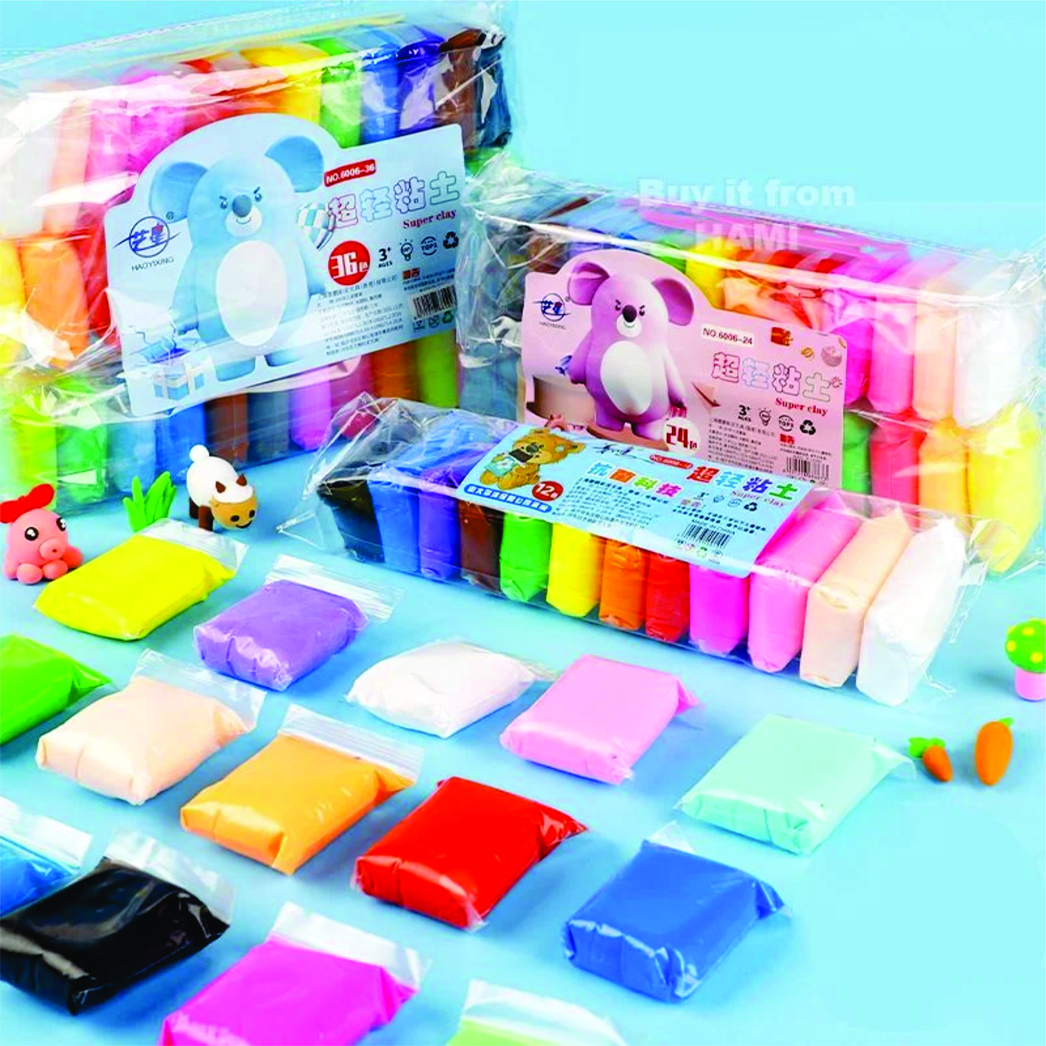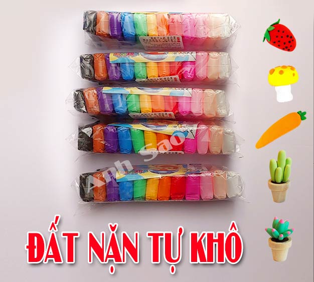 - Nếu đất bị ẩm hoặc nhão quá thì bạn có thể mở túi để ngoài nhiệt độ thường cho đất tự khô lại. (Lưu ý kiểm tra thường xuyên để đạt được độ khô mong muốn). + Không cần sấy, dễ dàng vệ sinh + Độ co rút tối thiểu - Thích hợp cho trẻ em trên 3 tuổi + Thích hợp cho những người yêu thích đồ thủ công + Để sản phẩm trong nhiệt độ phòng trong 24-48 giờ + Bột khô sau 3 giờ để ngoài môi trường + Các sản phẩm được mô hình hóa là permanat + Chất liệu: Xơ nhựa, Glycerin, màu thực phẩm và nước - Số lượng : 1 bịch đất sét 12/24/36 màu, kèm bộ dụng cụ - Màu sắc : nhiều màu, màu sắc rất tươi sáng ---------------------------------------------- Cách chơi: - Bước 1: Lau khô tay. Lấy 1 ít đất sét ra và vo lại, lúc này đất sét có thể hơi dính. Khoảng 3 - 4 phút sau đất sét sẽ bắt đầu tự khô lại. - Bước 2: Làm tương tự. Bước vò đất sét thành 1 cục tròn hơi tốn thời gian cần sự kiên nhẫn. - Bước 3: Khi đất sét đã thành 1 cục tròn, bỏ vào hủ tránh gió. - Bước 4: Nặn hình theo ý thích.