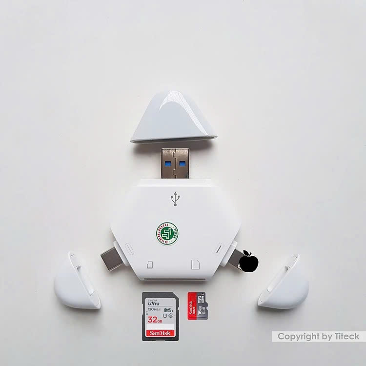 Thông số sản phẩm : Chất liệu : Nhựa ABS Kích thước : 65x65x65 mm Cổng kết nối : Type C, USB, L 8 pin Đầu đọc thẻ : SD , Micro SD (TF) Giúp