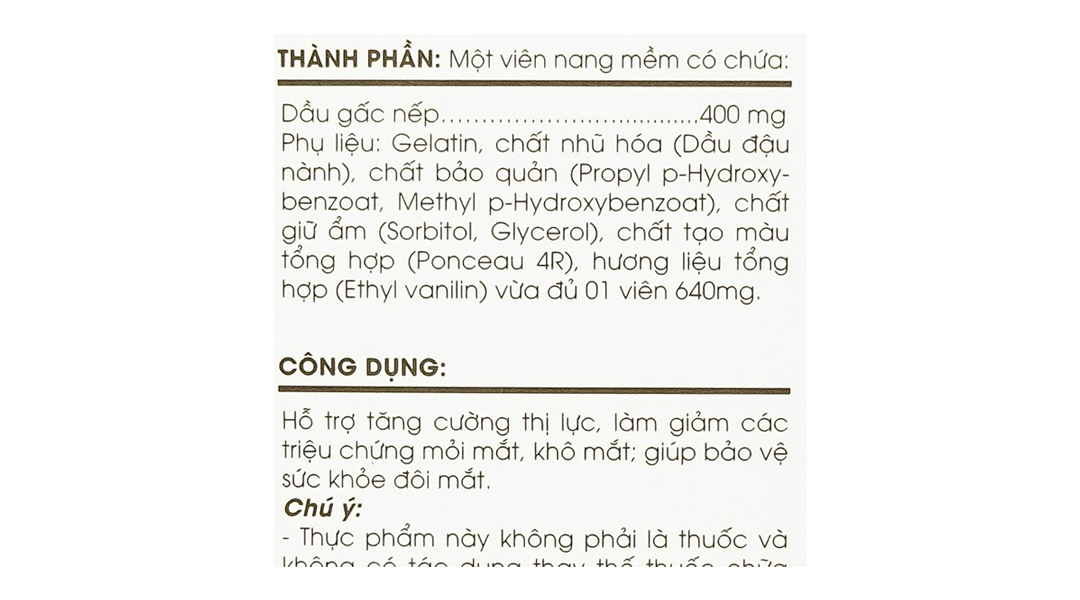 Thành phần Một viên nang mềm có chứa: Dầu gấc nếp: 400mg Công dụng Hỗ trợ tăng cường thị lực, làm giảm các triệu chứng mỏi mắt, khô mắt, giúp bảo vệ sức khỏe đôi