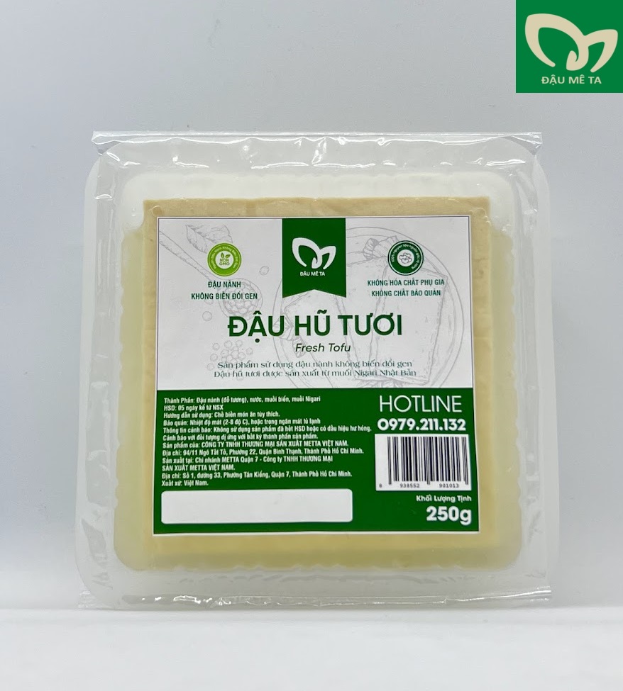 Với sản phẩm tươi sống, trọng lượng thực tế có thể chênh lệch khoảng 10%. ĐẬU HŨ TƯƠI VỊ NGUYÊN BẢN 250g Thành Phần: Đậu nành (đỗ tương), Nước, Muối biển Nigari HSD: 5 ngày kể từ ngày sản xuất Bảo quản: Nhiệt độ mát (2-8 độ C), hoặc trong ngăn mát tủ lạnh Thông tin cảnh bảo: Không sử dụng sản phẩm đã hết HSD hoặc có dấu hiệu hư hỏng. Cảnh báo dị ứng với bất kỳ thành phần nào của sản phẩm CÔNG TY TNHH THƯƠNG MẠI SẢN XUẤT METTA VIỆT NAM Chuyên sản xuất cung cấp ĐẬU HŨ TƯƠI NGUYÊN CHẤT Nguồn đậu nành KHÔNG biến đổi gen Nguồn gốc xuất xứ nguyên liệu rõ ràng, đảm bảo theo tiêu chuẩn quy định Đậu Hũ được làm từ muối Nigari Nhật Bản Chuyên cung cấp cho Nhà Hàng, Quán Ăn, Cafe Nhà xưởng máy móc hiện đại, đáp ứng chuẩn tiêu chuẩn phân khúc nhà hàng, quán ăn