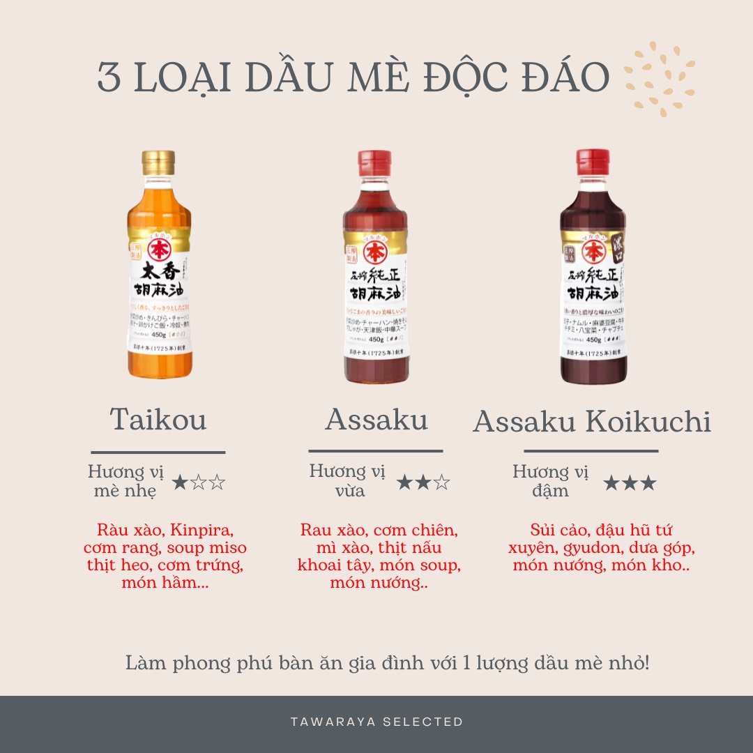 Trong ảnh từ trái sang: "Dầu mè Taikou", "Dầu mè Assaku" và "Dầu mè Assaku Koikuchi".