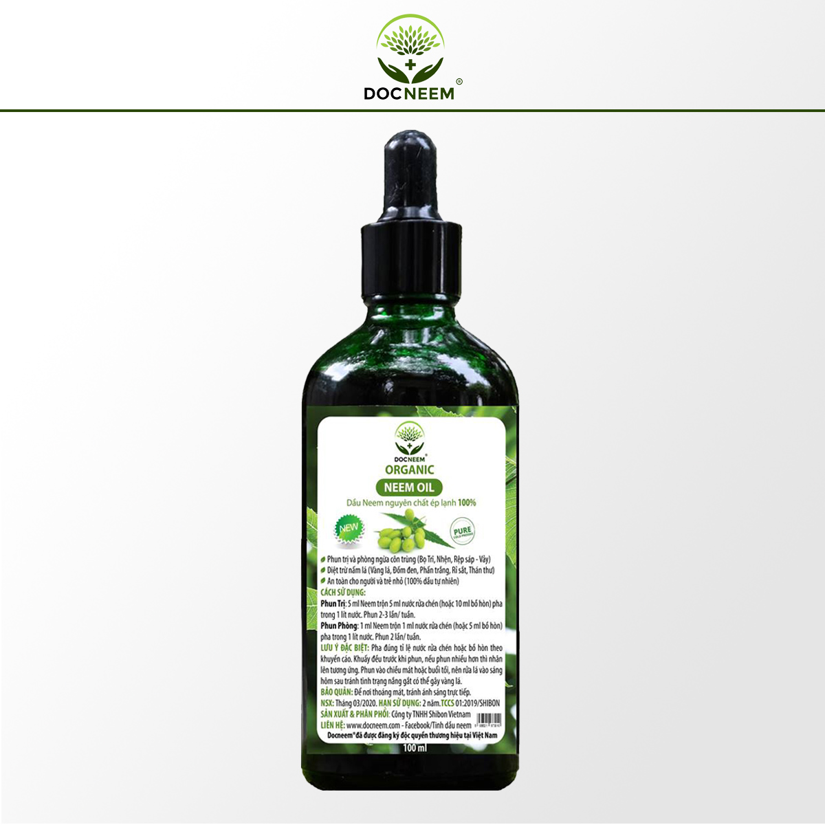 Thông tin dầu neem hữu cơ DOCNEEM: Thương hiệu DOCNEEM đã được đăng ký bảo hộ tại cục sở hữu trí tuệ Việt Nam. Dầu Neem oil nguyên chất được ép theo công nghệ hiện đại "COLD PRESSED" ép lạnh từ quả và hạt Neem. Có hàm lượng Aradirachtin tự nhiên cao nhất thị trường 2950ppm. Chai thủy tinh cao cấp 100ml. Dầu Neem DOCNEEM có màu vàng óng, theo công thức ép lạnh mới nhất Công dụng dầu neem hữu cơ DOCNEEM:  Diệt côn trùng (Bọ trĩ, nhện, rệp vảy, rệp sáp) cho cây trồng như Hoa hồng, hoa lan, Dâu, các rau ăn lá, cây ăn trái. Diệt bệnh nấm cho cây trồng (Đốm đen, phấn trắng, thán thư, vàng lá). Phun trị và phun phòng côn trùng cho cây trồng và khu vườn. Dùng dầu neem hữu cơ DOCNEEM không bị kháng thuốc. Đặc biệt an toàn tuyệt đối cho người và trẻ nhỏ. Không ảnh hưởng đến côn trùng có lợi như ong bướm. Cơ chế dầu neem hữu cơ DOCNEEM: Làm ức chế sự phát triển của trứng, nhộng các loại sâu bệnh. Hạn chế sâu bệnh đẻ trứng Ngăn chặn sự lột xác của sâu bệnh gây hại. Gây chán ăn và làm chết ngạt sâu bệnh hại hoa hồng. Chuyên trị sâu bênh, nấm, virus trên hoa hồng Hướng dẫn sử dụng dầu neem hữu cơ DOCNEEM:  Chuẩn bị dụng cụ đong dầu neem (có thể dùng ống cốc đong hoặc ống tiêm có vạch chia ml). Phun trị: Dùng 5ml dầu neem + 5 ml nước rửa chén (hoặc pha với 10ml dung dịch bồ hòn), quấy đều kỹ rồi pha trong 1 lít nước. Lắc quấy kỹ trước khi phun. Nếu có nhiều cây, sử dụng nhiều hơn thì tăng dầu neem và nước rửa chén theo tỉ lệ tương ứng để phun đẫm 2 mặt lá Tuần phun 2 -3 lần, vào chiều mát khi hết bệnh (lá non không còn xoăn, cây khỏe) thì chuyển sang phun phòng. Phun Phòng: Dùng 1-2ml neem pha với 1-2 ml nước rửa chén ( hoặc pha với 5ml dung dịch bồ hòn), quấy đều kỹ rồi pha trong 1 lít nước. Lắc quấy kỹ trước khi phun. Tuần phun 1-2 lần, vào chiều mát (có thể rửa lại lá vào sáng hôm sau). Vệ sinh cây rất quan trọng.  Kết hợp vệ sinh cây dùng vòi xịt nước mạnh tuần 1-2 lần rửa lá là hết trĩ nhện. Lá xoăn, nấm lá thì ngắt bỏ lá bệnh, bỏ thùng rác, tiêu hủy, không để dưới gốc cây để trừ mầm bệnh. Không gây kháng thuốc và an toàn với con người