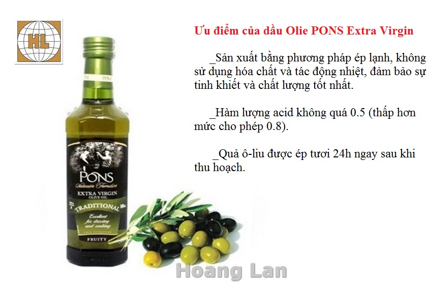 - Dầu Olive Extra Virgin PONS 500ml - Tây Ban Nha ( Chai Thủy Tinh ) - _Thời hạn sử dụng: 30 tháng kể từ ngày sản xuất - _NSX, HSD: Xem trên bao bì. - _Thể tích thực: 500 ml - _Xuất xứ: Euroaliment P.A.C., S.L.U (Tây Ban Nha) - - Đây là một loại chất béo được chiết xuất từ loại quả của cây Olive hay có tên quốc tế là Olea Europaea. Loại cây này là đặc sản mang tên tuổi của vùng đất Địa Trung Hải. Dầu Olive được sử dụng rộng rãi trong cuộc sống. Tuy nhiên được ưu tiên và chú trọng trong lĩnh vực mỹ phẩm, nấu ăn và dược liệu. - - _ Dầu Olive Extra Virgin PONS 250ml - Tây Ban Nha được sản xuất theo phương pháp ép lạnh, không đòi hỏi sử dụng hóa chất hay tác động nhiệt vào quy trình, giúp dầu giữ lại được các chất dinh dưỡng và có độ tinh khiết cao nhất. Vì vậy mà dầu Olive ép lạnh được nghiên cứu là mang lại nhiều lợi ích về sức khỏe hơn dầu Olive thông thường. - - _ Phần lớn chất béo chứa trong dầu Olive Pons Extra Virgin đều là chất béo không bão hòa rất tốt cho sức khỏe. Tiêu thụ chất béo không bão hòa giúp giảm khả năng mắc các bệnh tiểu đường loại 2, tim, ung thư và bệnh mãn tính. Dầu Olive ép lạnh cũng chứa ít nhất 30 hợp chất thực vật có lợi, nhiều chất chống oxy hóa mạnh có tác dụng chống viêm, hạ huyết áp, ngăn chặn sự phát triển của một số loại ung thư. Dầu Olive hoàn toàn có thể thay thế dầu ăn thông thường và là thực phẩm bổ sung lành mạnh. - - _Dầu có hàm lượng acid không quá 0.5o - - _Hương vị thơm ngon đậm đà hơn nhờ quả ô-liu được ép tươi ngay sau khi thu hoạch - - _Thành phần: Dầu Olive nguyên chất 100% được sản xuất theo phương pháp ép lạnh quả tươi ngay sau khi thu hoạch. -