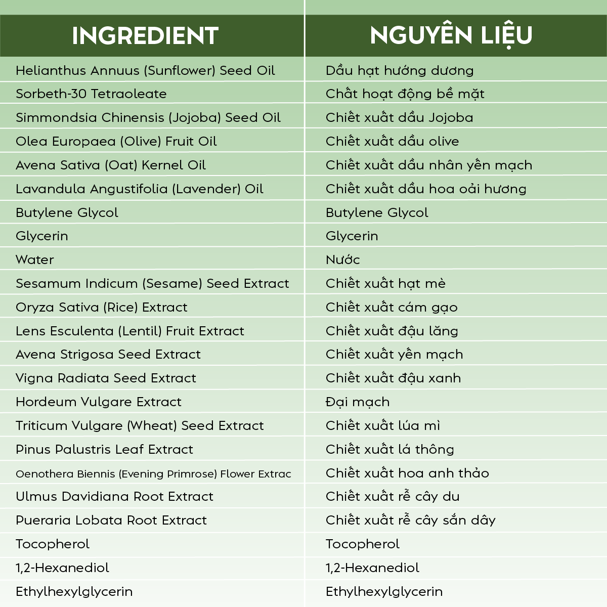 ● Dầu hạt jojoba, dầu hoa oải hương, dầu hạt hướng dương, dầu nhân yến mạch, dầu olive: làm sạch tạp chất nhẹ nhàng lấy đi lớp make up, không gây khô căng da sau khi tẩy trang