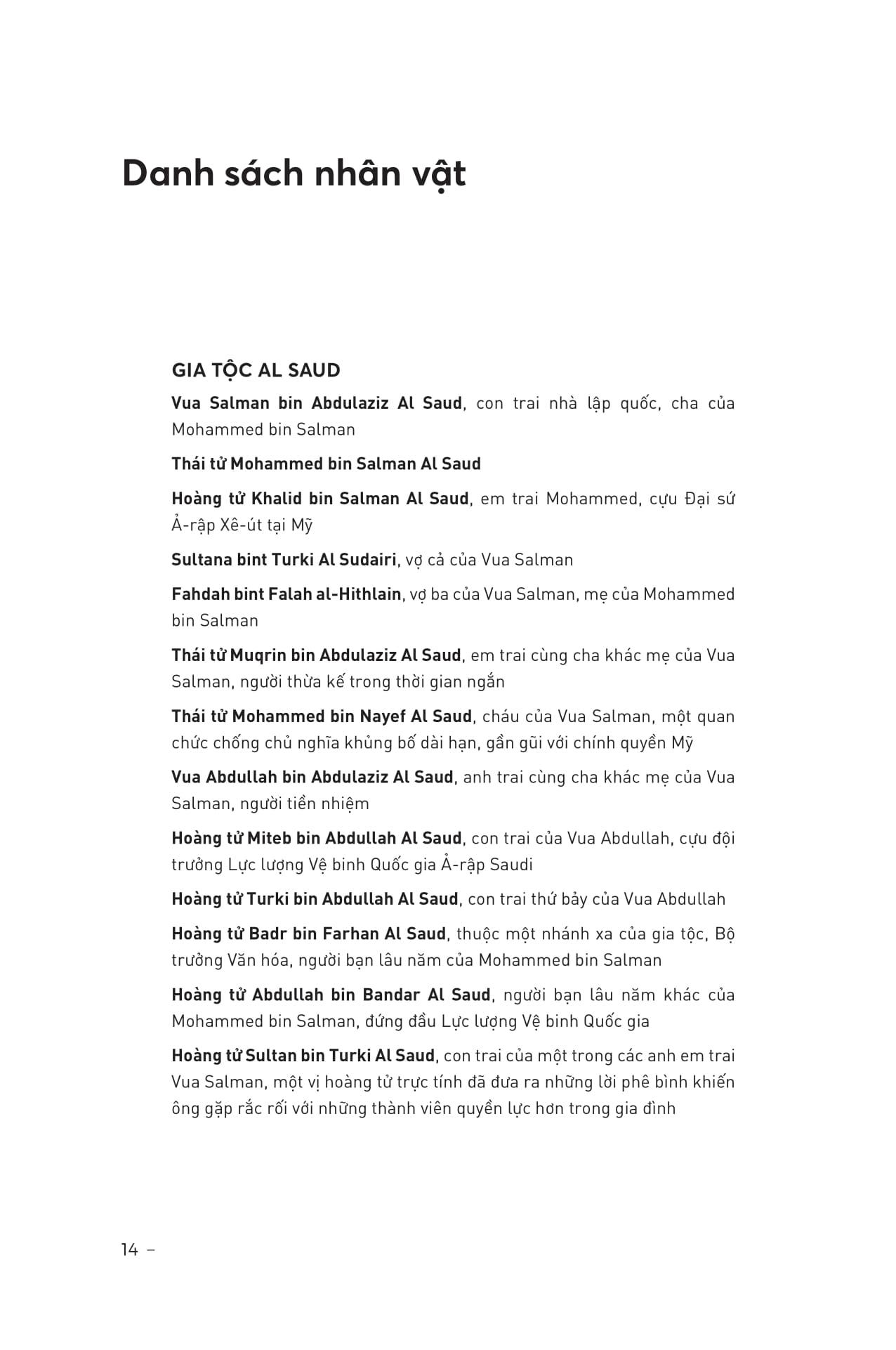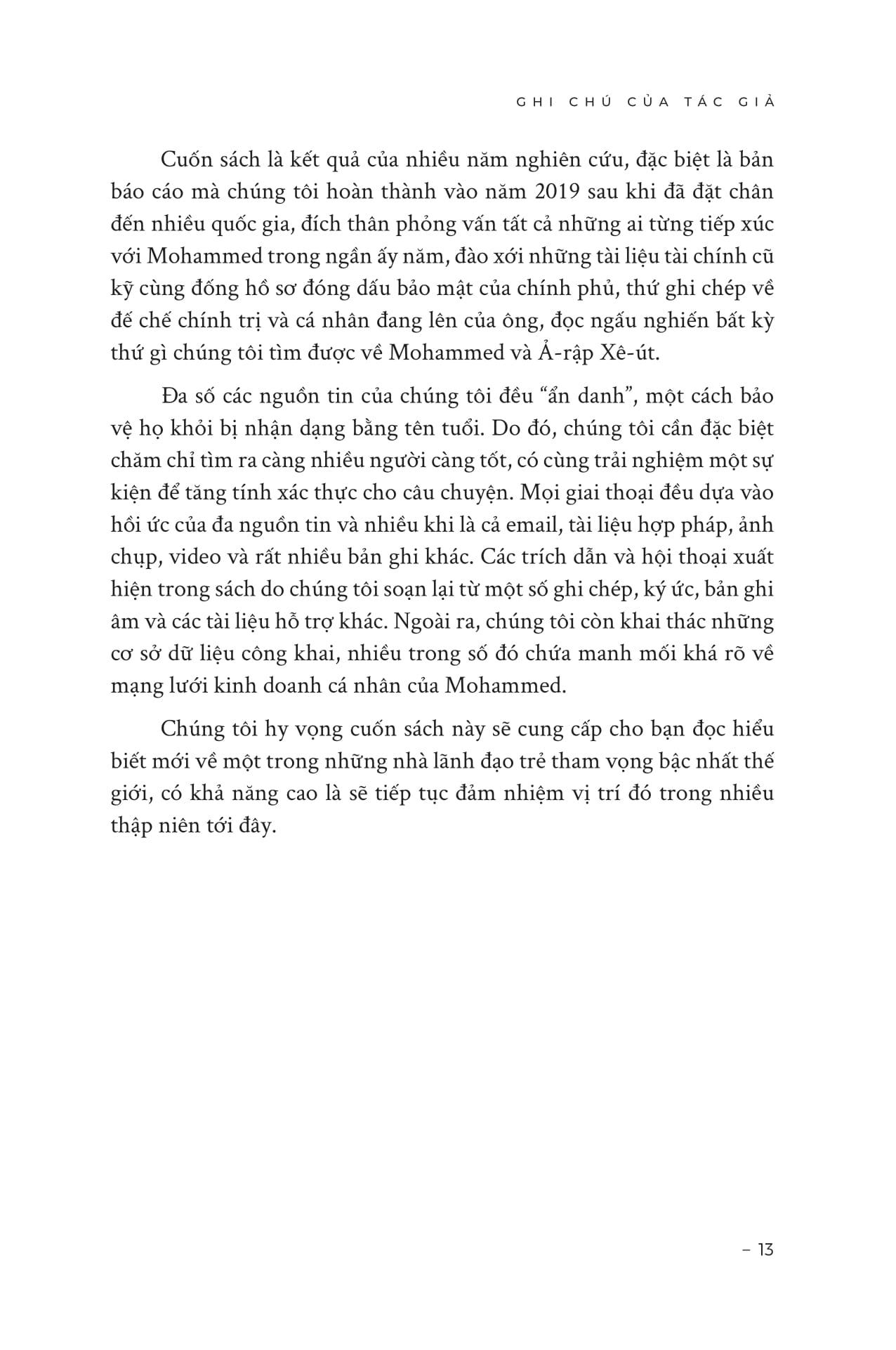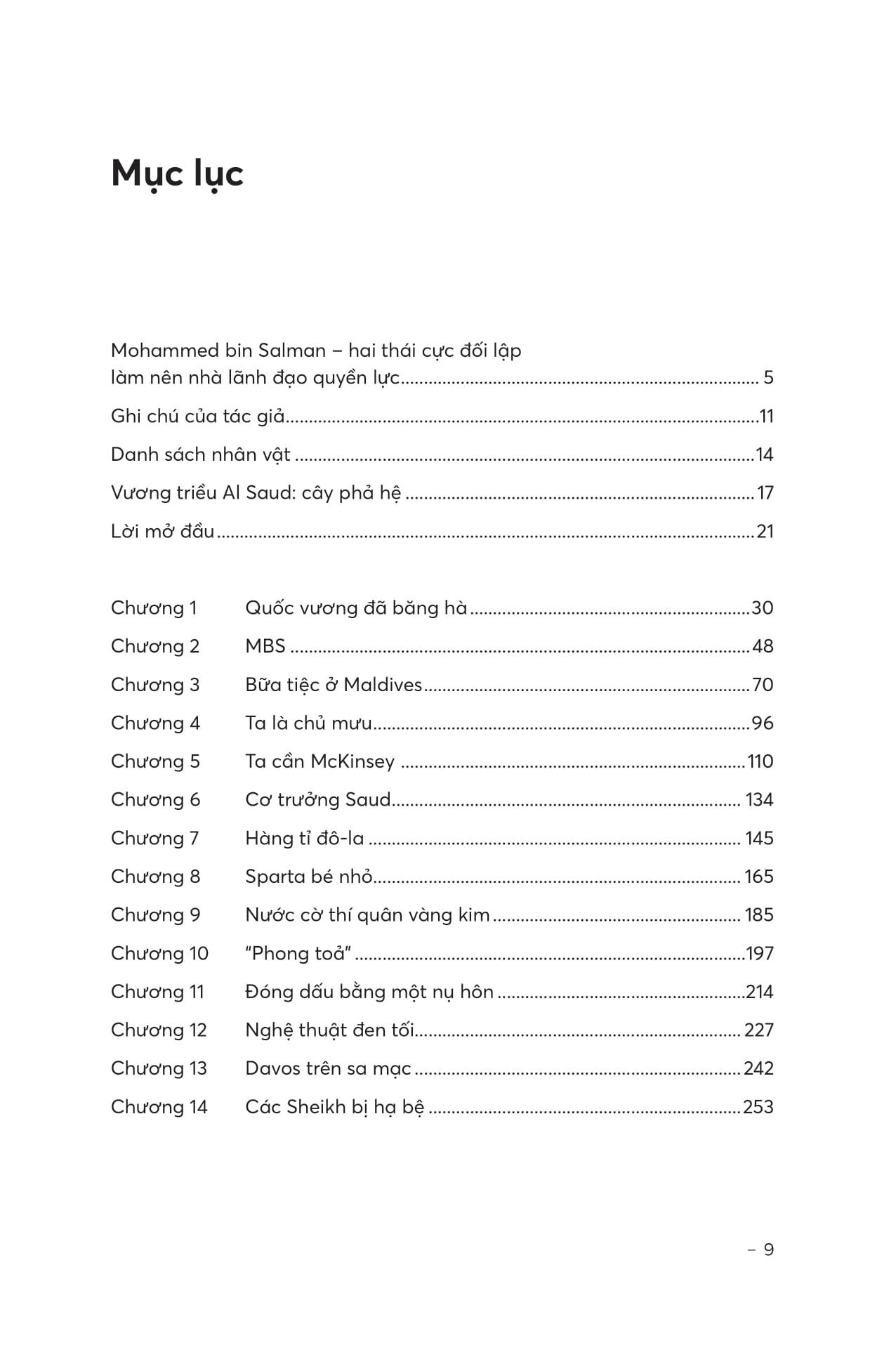 Từ những khoản đầu tư khổng lồ vào công nghệ; sử dụng dầu mỏ như một v.ũ khí kinh tế; cho đến những cải cách mạnh mẽ trong nướ Cuốn sách đã cung cấp cái nhìn về sự nổi lên của Thủ tướng, Thái tử Mohammed Bin Salman. Điều gì đã đưa vị thái tử sinh năm 1985 không chỉ nhanh chóng nắm bắt quyền lực tại Ả-rập Xê-út, mà giờ đây đã trở thành một trong những nhân vật chính trị và kinh tế quan trọng nhất thế giới? Nội dung cuốn sách vẫn còn có những điều gây tranh cãi. Nhưng đây là tác phẩm không thể thiếu cho những ai muốn hiểu rõ hơn về sức mạnh, sự tham vọng, và tương lai của Ả-rập Xê-út dưới thời Mohammed bin Salman.