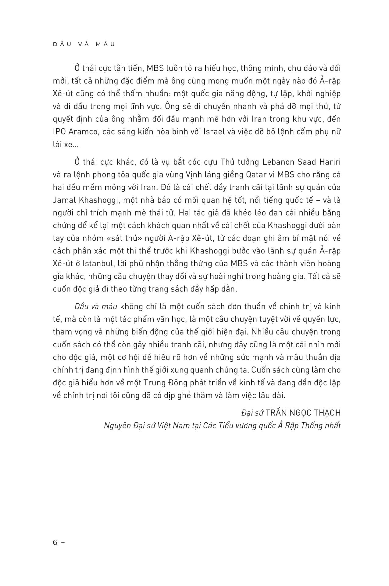 Dầu và Máu đã mở cánh cửa hiểu biết tới với thế giới kín đáo và quyền lực Ả-rập Xê-út thông qua nhân vật trung tâm – Thủ tướng, Thái tử Mohammed Bin Salman.