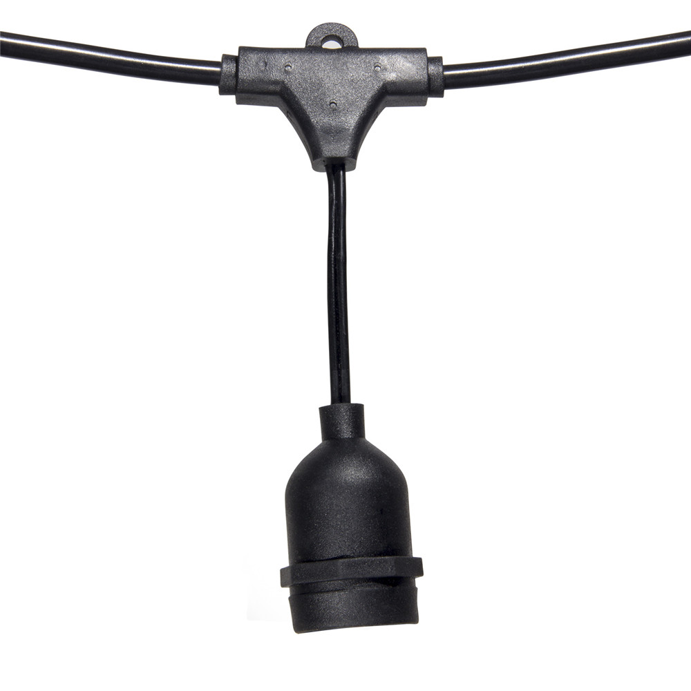 Chất liệu: Dây dẫn điện lõi đồng kết hợp đui đúc E27 Màu sắc dây: Màu đen Ánh sáng bóng đèn: Trắng hoặc vàng nắng Phù Hợp Trang trí ngoài trời, trong nhà, với khả năng chống chịu nước tuyệt đối Đui làm bằng đồng loại 1 tiếp xúc tốt, bề Đui đèn bọc ngoài là nhựa PC: chịu va đập, chống cháy không ngả màu theo thời gian Đui đèn E27 phù hợp cho hầu hết các loại bóng đèn trên thị trường Cốc và lưỡi gà dễ xoáy, tiếp xúc tốt, không bị move, chập chờn trong quá trình sử dụng Khoảng cách giữa các đui là 50cm, dây thả xuống 15cm