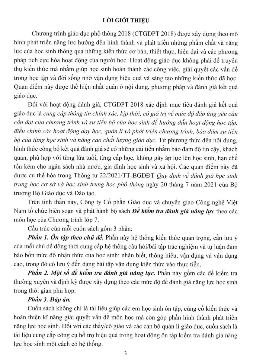 Trên tinh thần này, Công ty Cổ phần Giáo dục và chuyển giao Công nghệ Việt Nam tổ chức biên soạn và phát hành bộ sách Đề kiểm tra đánh giá năng lực theo các môn học của Chương trình lớp 7.