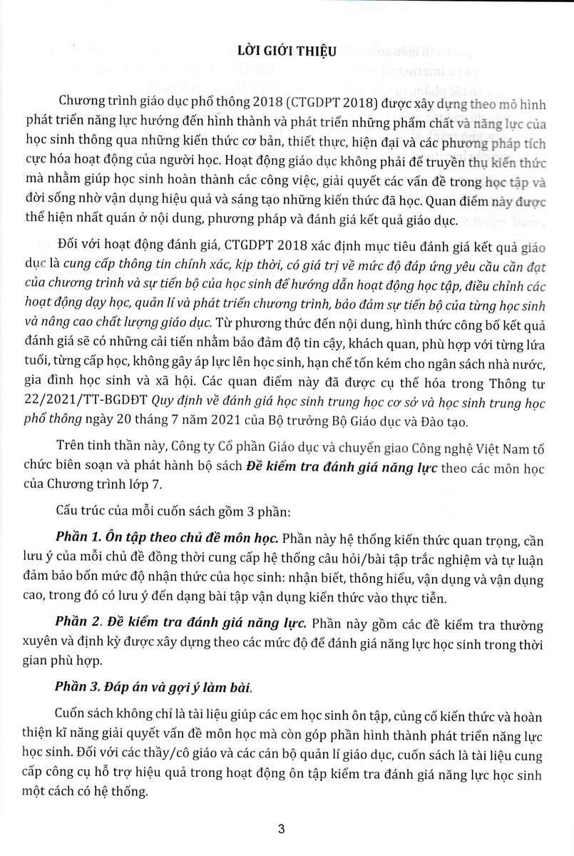 Phần 2. Đề kiểm tra đánh giá năng lực. Phần này gồm các đề kiểm tra thường xuyên và định kỳ được xây dựng theo các mức độ để đánh giá năng lực học sinh trong thời gian phù hợp.
