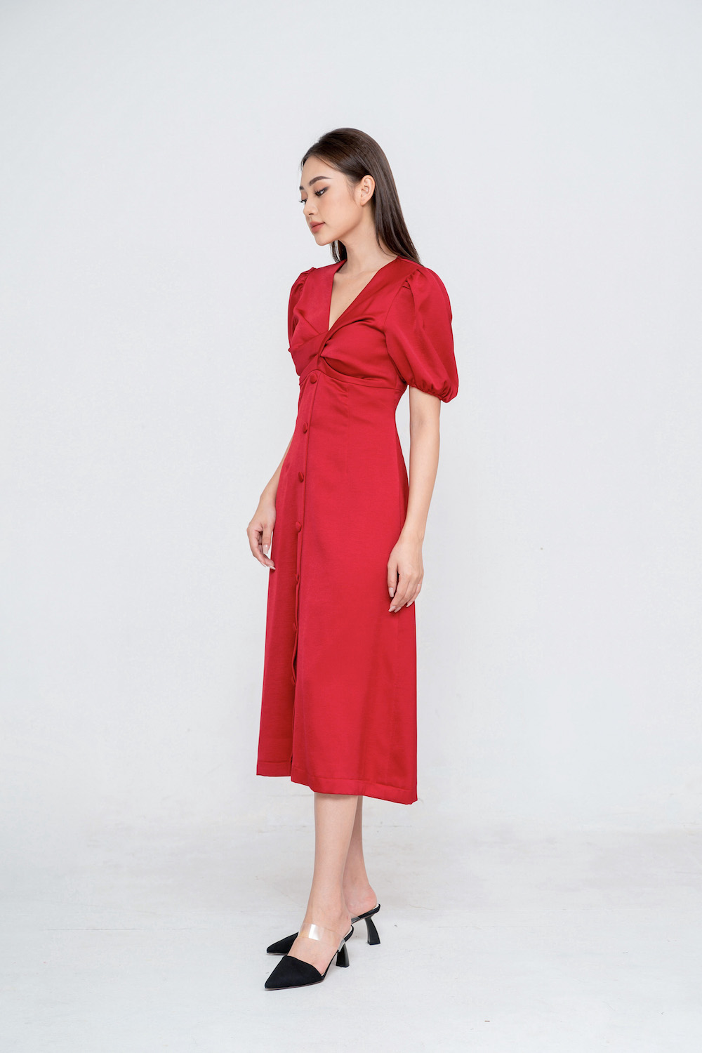 ✨De Leah - Đầm ôm midi xoắn nơ ngực đỏ