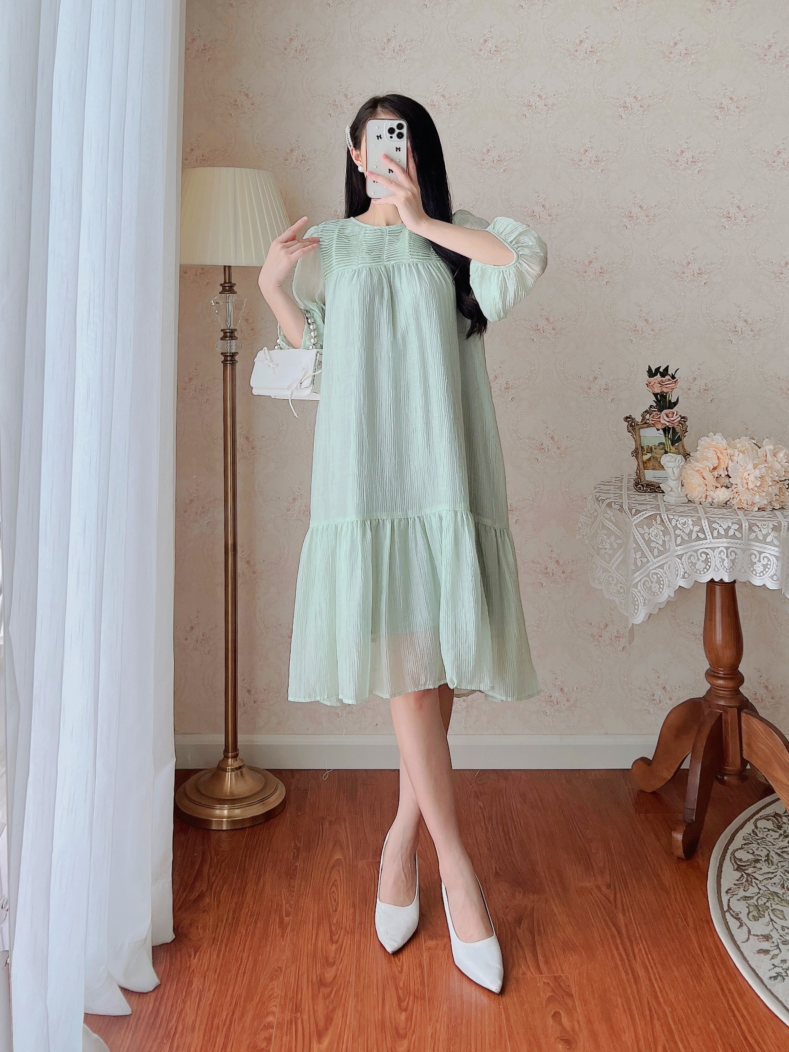 ღ THÔNG TIN SẢN PHẨM: Tên sản phẩm: Đầm voan xám phối bèo Chất liệu: Chất voan tơ Chi tiết sản phẩm: có lót, không túi Thông số size: S, M,