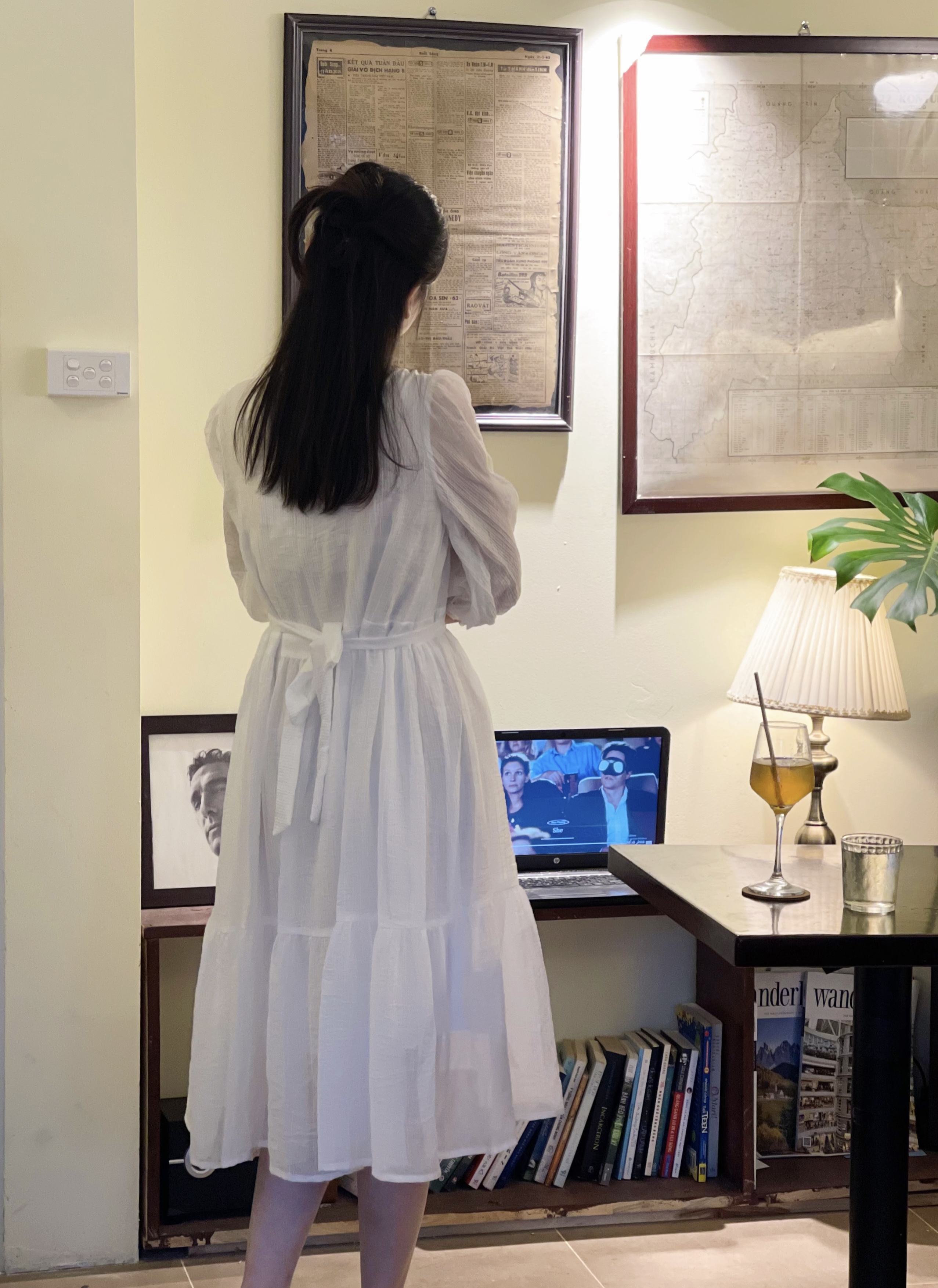 D4980] Váy thiết kế ren cúc bọc tay bồng pha chân tơ dáng dài Shop về 2 size S.M 2 màu trắng và kem Sản phẩm này là tài sản cá nhân được bán bởi