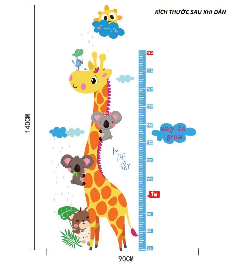 Decal dán tường Thước đo chiều cao Hươu cao cổ có màu sắc tươi sáng, vui nhộn. Decal với các hoạ tiết nhân vật hoạt hình, đem lại cảm giác như những người bạn thân thiết của bé ngay trong căn phòng xinh xắn của mình. Decal làm bằng nhựa trong PVC, thân thiện với môi trường, không thấm nước, có thể lau chùi sau khi dán.