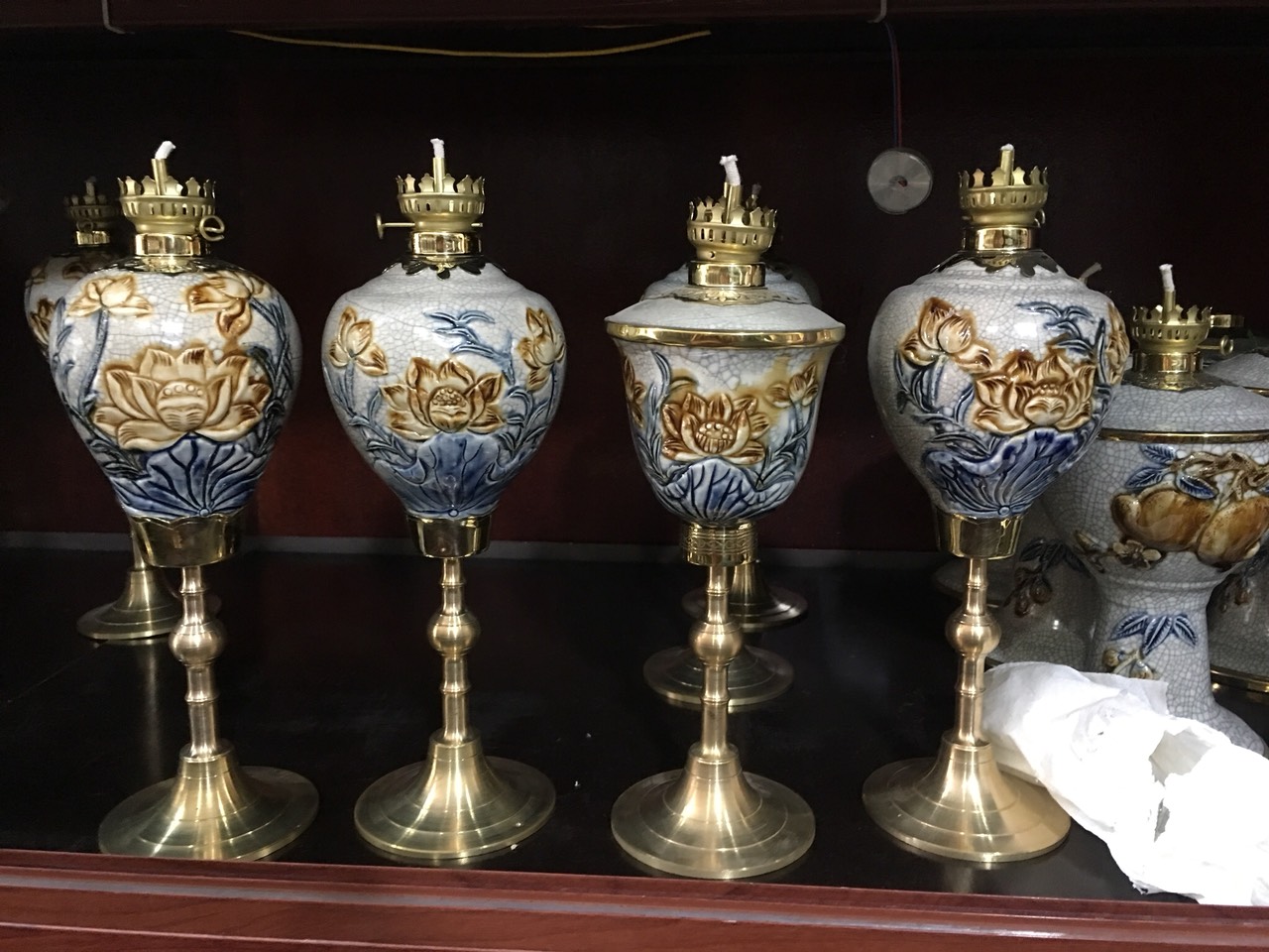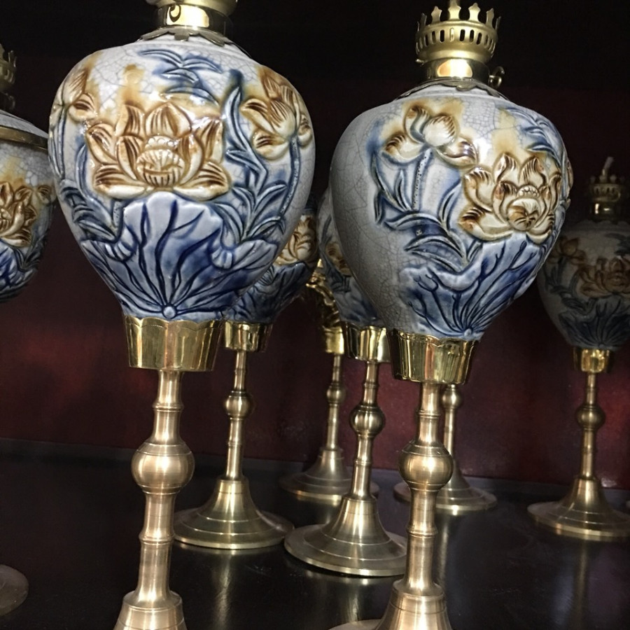 Đèn dầu gốm sứ men rạn Bát Tràng chân đồng đắp nổi hoa sen Từ lâu đèn dầu đã đóng vai trò quan trọng trong văn hóa thờ cúng của người Việt Nam. Chiếc đèn