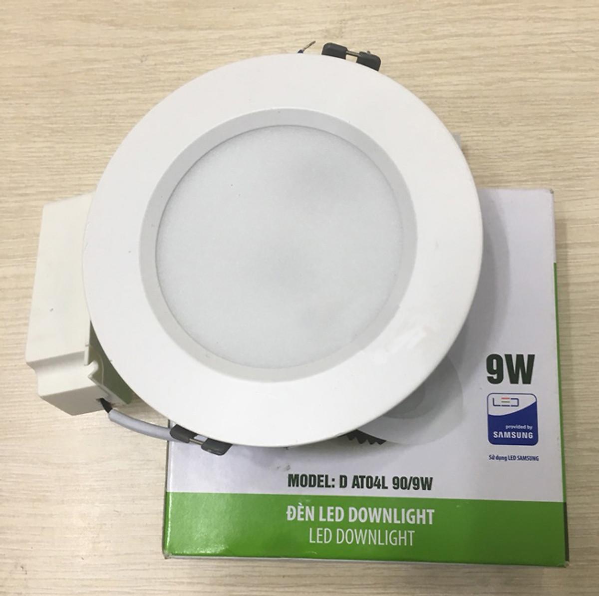 Đèn LED âm trần Downlight 90/9W Model: AT04 90/9W Công suất: 9W Tuổi thọ: 20.000 giờ Điện áp hoạt động: (150 ÷ 250)V Quang thông: 650lm/630lm Nhiệt độ màu: 6500K/3000K Kích thước (ØxH): (118x40)mm ĐK