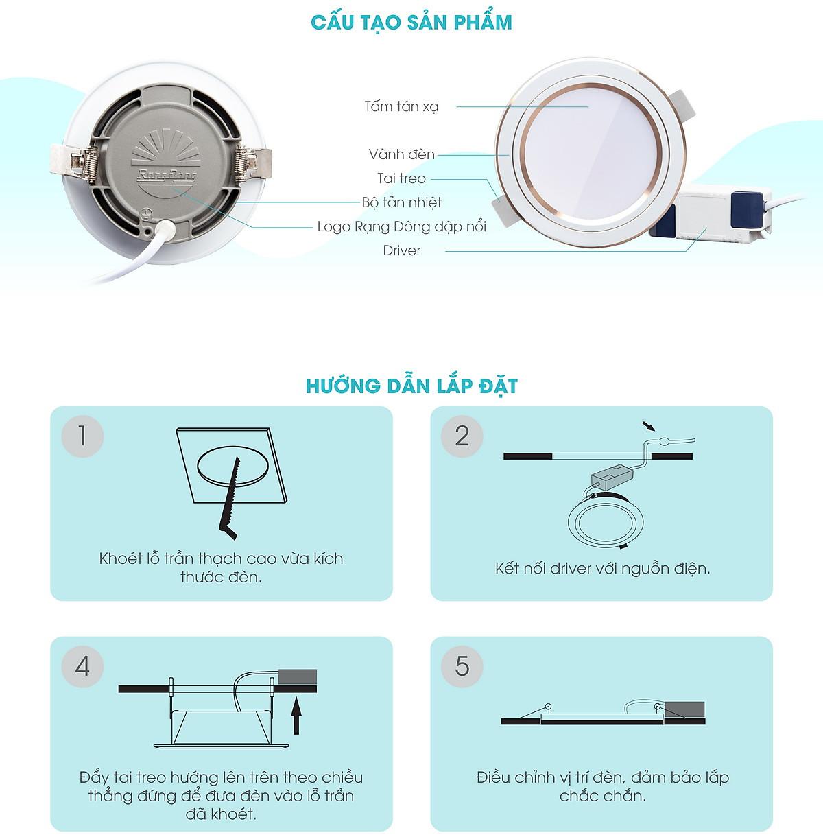 Công suất: 10W Điện áp: 220V/50Hz Quang thông: 1000lm Đổi 3 màu ánh sáng: Trắng/Vàng/Trung tính Kích thước (ØxH): (123x45)mm ĐK lỗ khoét trần: 110mm
