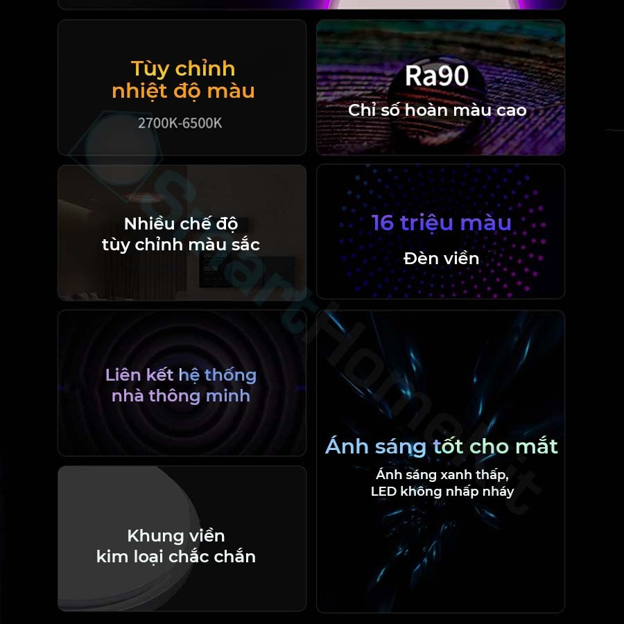 - Màu sắc phạm vi nhiệt độ: 2700K ~ 6500K Tạo không gian sống đa sắc màu cùng đèn Aqara Đèn ốp trần Aqara T1M RGB Smart Ceiling là đèn trần thông minh với thiết kế sáng tạo cùng ánh sáng rực rỡ. Đèn ốp trần Aqara T1M Symphony được kết hợp giữa mặt đèn chính có thể thay đổi độ sáng cùng vòng sáng 16 triệu màu. Hai đèn có thể điều khiển riêng biệt hoặc cùng nhau để đạt được không gian màu sắc bạn muốn. Ánh sáng chính từ 32-40W có thể điều chỉnh độ sáng từ 1-100% và nhiệt độ màu từ vàng ấm đến sáng trắng 2700K-6500K để phù hợp với bất kì tâm trạng nào. Vòng sáng RGB 16 triệu màu cùng các hiệu ứng động Điểm nhấn của đèn ốp trần Aqara T1M là vòng sáng RGB có thể điều chỉnh và nhiều hiệu ứng khác nhau. Tương tự như , Aqara T1 Symphony có thể thay dổi màu sắc trong bảng màu RGB và khả năng đồng bộ với âm thanh chắc chắn sẽ khiến không gian sống của bạn thêm phần sống động. Chiếu sáng căn phòng của bạn theo nhiều phong cách Đèn trần thông minh Aqara T1M mang đến sự linh hoạt vô song cho hệ thống chiếu sáng ngôi nhà của bạn. Thay đổi độ sáng từ 3-100% bằng ứng dụng Aqara và thay đổi nhiệt độ màu từ vàng ấm – sáng trắng một cách dễ dàng. Tạo một không gian có ánh sáng rực rỡ cho những công việc cần tập trung hoặc một môi trường có ánh sáng dịu để thư giãn buổi tối. Đa dạng cách điều khiển đèn Aqara Symphony Được tối ưu hóa để tích hợp với các hệ sinh thái nhà thông minh hàng đầu như Apple HomeKit, Google Home, Alexa. Đèn trần Aqara T1M có thể kiểm soát và điều chỉnh ánh sáng thông qua nhiều phương pháp khác nhau. Chỉ một chạm nhanh trên điện thoại thông minh đến sự tiện lợi của c, đảm bảo việc quản lý ánh sáng trong nhà của bạn vừa đơn giản vừa hiệu quả. Lên lịch để đèn có thể tự hoạt động Đèn trần này cũng cung cấp các tùy chọn để điều chỉnh độ sáng tự động. Bạn có thể đặt đèn tự động tắt vào một thời điểm nhất định, chẳng hạn như 10 giờ tối, để báo hiệu một cách tinh tế rằng đã đến giờ đi ngủ. Ở cài đặt độ sáng tối thiểu, T1M giảm xuống 0,3% độ sáng, khiến nó trở nên lý tưởng làm đèn ngủ. Hệ thống chiếu sáng thích ứng Apple Adaptive Lighting Khám phá những khả năng tiên tiến của công nghệ Chiếu sáng thích ứng của Apple ()với đèn trần Aqara Symphony T1. Bằng cách kích hoạt tính năng này trong ứng dụng Apple Home, đèn sẽ tự động thay đổi nhiệt độ màu trắng để phù hợp với thời gian trong ngày – phát ra tông màu mát hơn vào giữa trưa và chuyển sang màu sắc ấm hơn khi buổi tối đến gần. Khi bạn giảm độ sáng, ánh sáng sẽ chuyển đổi mượt mà sang tông màu ấm áp, dễ chịu hơn, tạo ra bầu không khí ấm cúng.