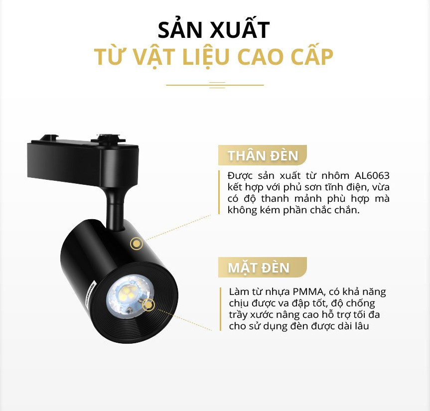 - Thân đèn được sản xuất từ nhôm AL6063, kết hợp với phủ sơn tĩnh điện, vừa có độ thanh mảnh phù hợp mà không kém phần chắc chắn.
